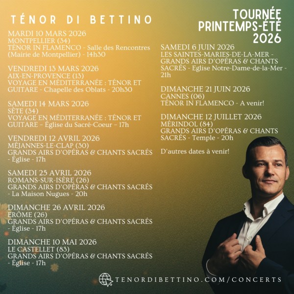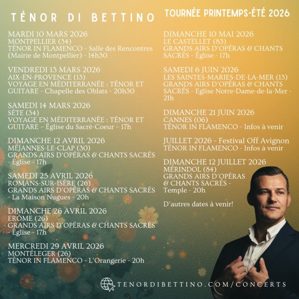 Le Ténor Di Bettino et ses musiciens vous donnent rendez-vous dès le mardi 10 mars pour la tournée de Printemps-Eté 2026! Informations et Réservations sur la page tenordibettino.com/concerts Retrouvez le planning actuel ci-dessous : MARDI 10 MARS 2026 - MONTPELLIER (34) - SALLE DES RENCONTRES (MAIRIE DE MONTPELLIER) - "TÉNOR IN FLAMENCO" (Ténor Di Bettino... Lire la Suite →