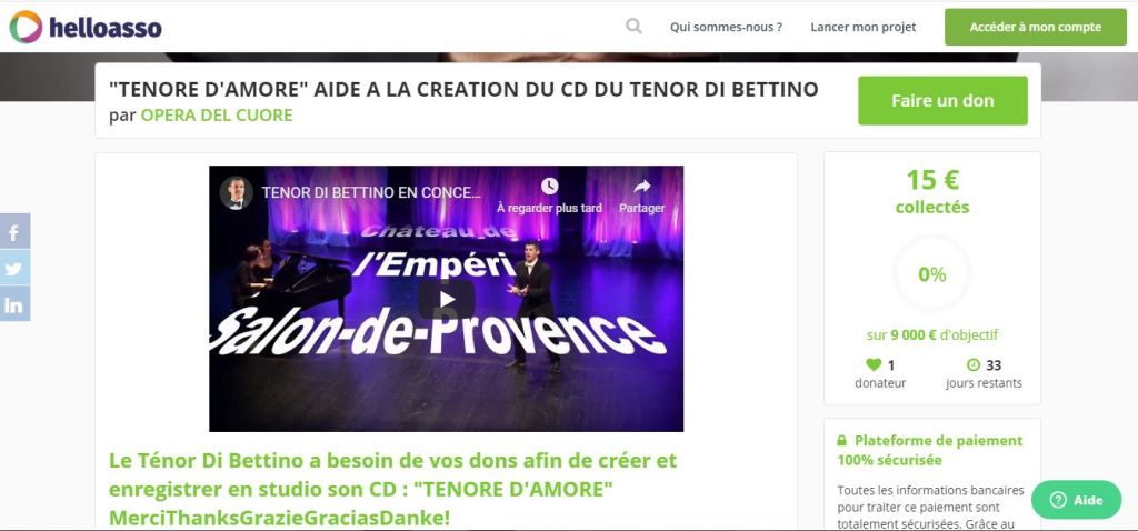 Aujourd’hui, le Ténor Di Bettino a évoqué officiellement son projet de création de CD! Une initiative de financement participatif a ainsi été lancée (crowdfunding) via le site helloasso.com.