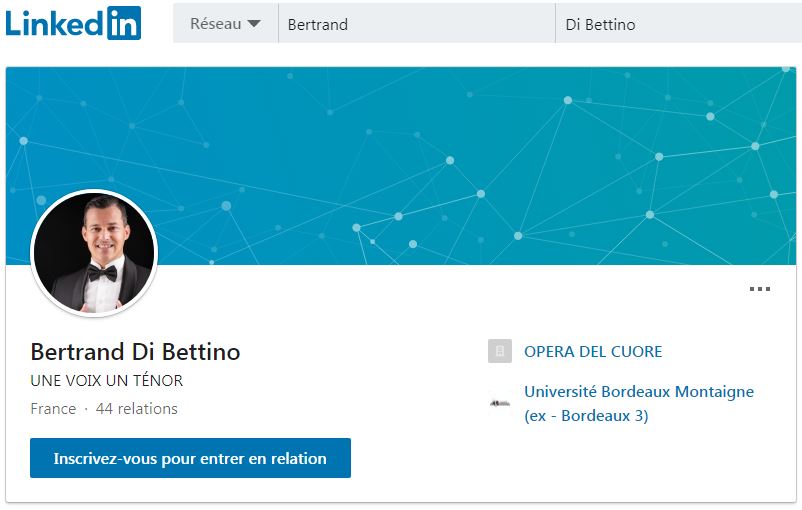 Rendez-vous sur le compte Linkedin du Ténor Di Bettino à cette adresse : https://fr.linkedin.com/in/bertrand-di-bettino-0442a21a9