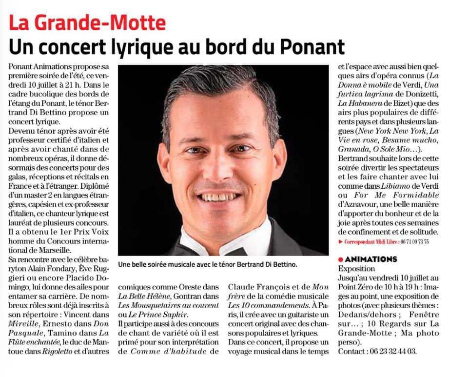 Le Ténor Di Bettino est présent aujourd’hui dans le journal « Midi Libre », édition du 10 juillet 2020, pour son concert à La Grande Motte, à partir de 21h, « dans le cadre bucolique des bords de l’étang du Ponant ». L’article est aussi disponible sur le site internet du journal sur cette page. Bonne lecture!