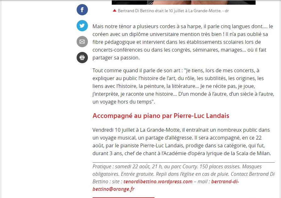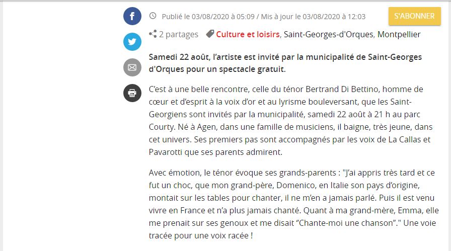 Le Ténor Di Bettino était présent cette semaine dans le journal « Midi Libre », édition du 3 août 2020, en prévision de son concert à St-Georges d’Orques le 22. L’article est aussi disponible sur le site internet du journal sur cette page. Bonne lecture!