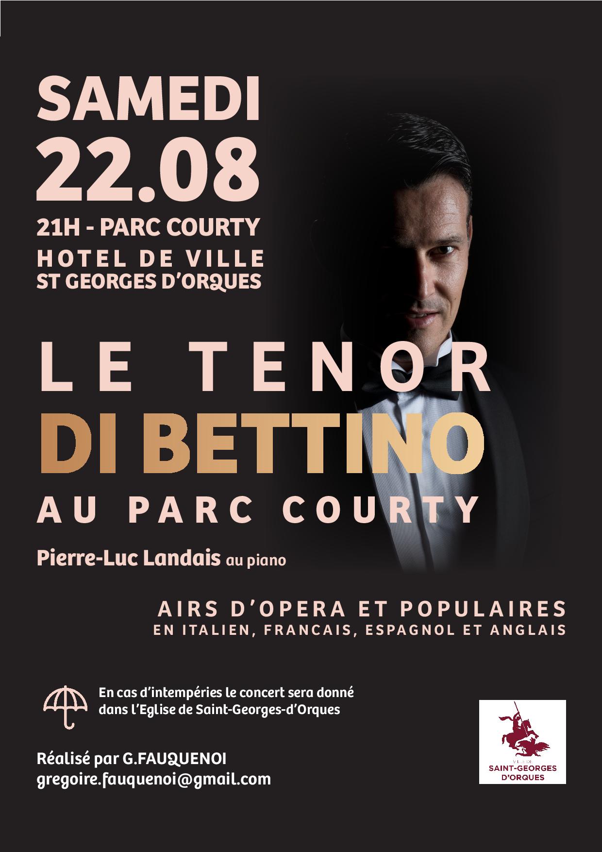 Comme vous le savez, le Ténor Di Bettino sera en concert gratuit à St-Georges d’Orques, non loin de Montpellier, samedi 22 août. Le Ténor travaille en ce moment pour nous offrir un spectacle inoubliable! Grâce à l’engagement de la municipalité, le spectacle bénéficiera de moyens artistiques conséquents (pianiste, violoniste, danseuse, etc…) et des surprises sont au programme.