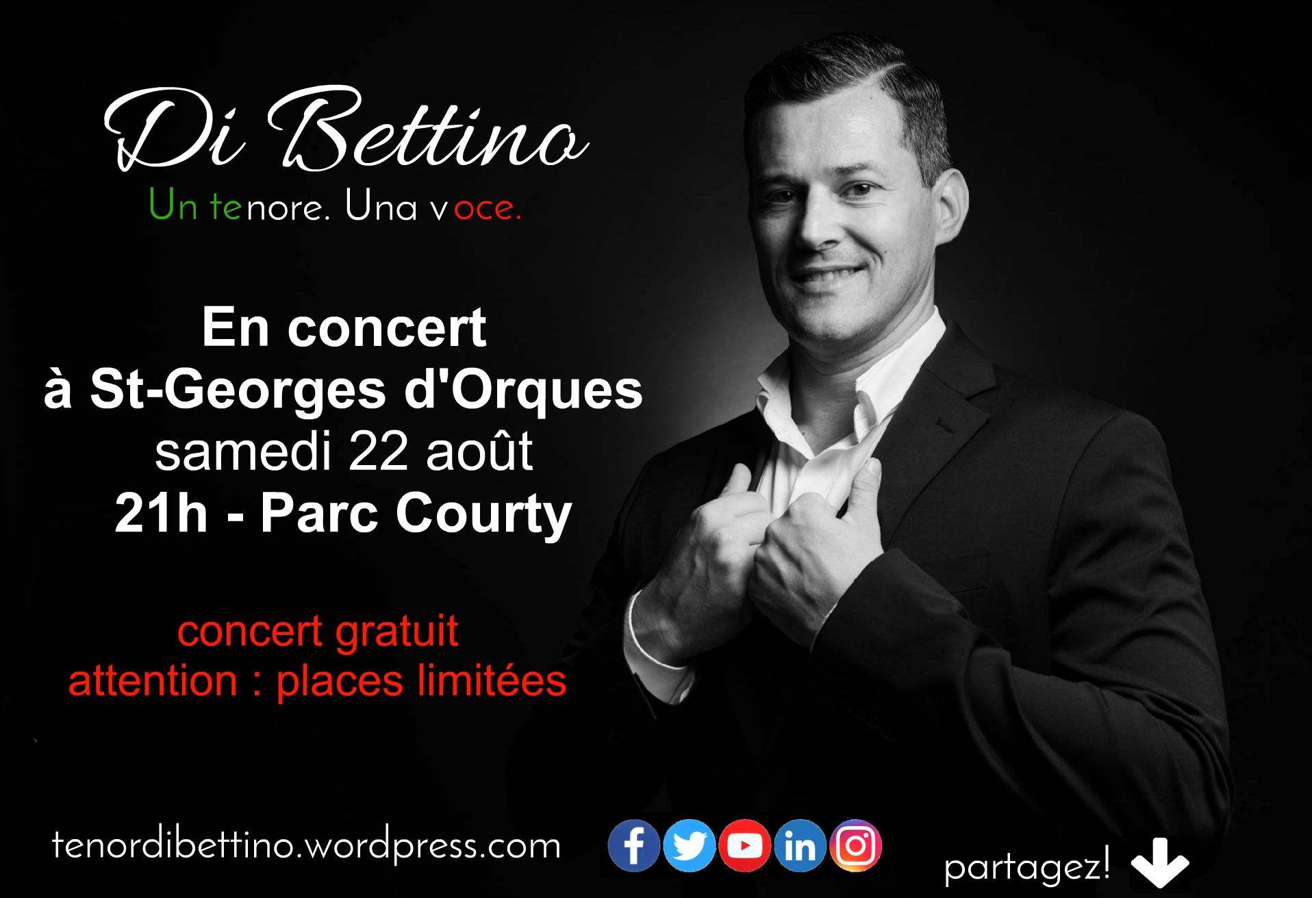 Comme vous le savez, le Ténor Di Bettino sera en concert ce samedi à St-Georges d’Orques, près de Montpellier. Ce sera un concert exceptionnel, avec pianiste, violoniste et danseurs, dans un cadre splendide. Que demander de plus, d’autant plus que l’événement sera gratuit!