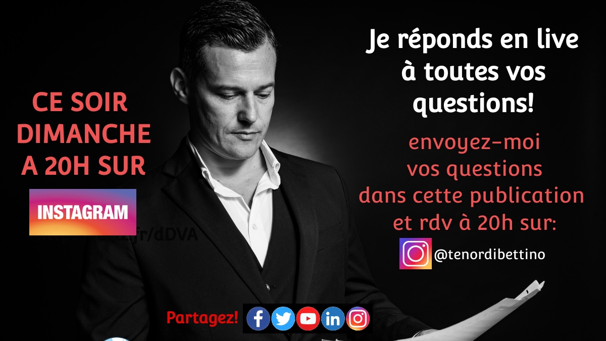Ce soir, le Ténor Di Bettino vous donne rdv en direct à 20h sur Instagram. Posez-lui toutes vos questions dès maintenant sur la publication faite sur ces réseaux Facebook et Instagram, il vous répondra à propos de tous les sujets!