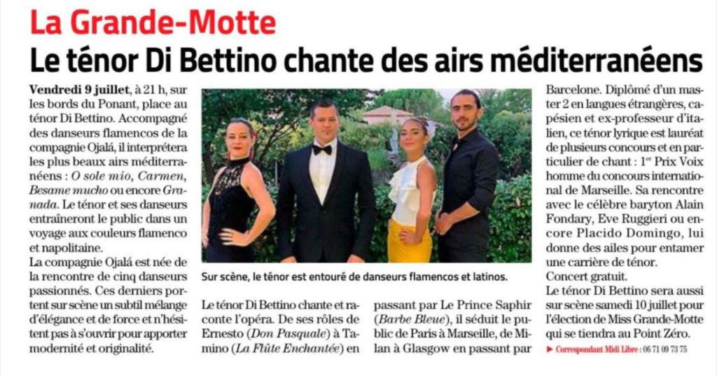 Le Ténor Di Bettino était présent hier dans le journal « Midi Libre », édition du 8 juillet 2021, en prévision de son concert à La Grande Motte le 9. L’article est aussi disponible sur le site internet du journal sur cette page. Bonne lecture!