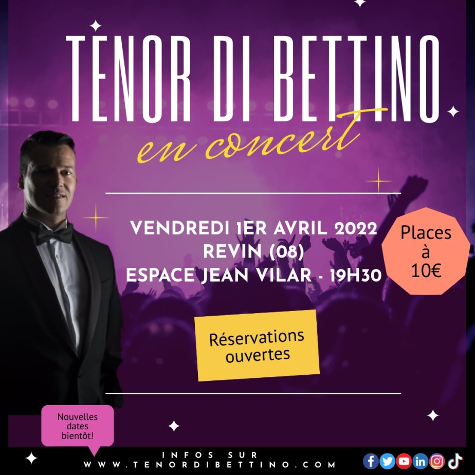 Après le succès de son concert à Belley, le Ténor Di Bettino poursuit sa tournée en France et donnera 2 concerts cette semaine dans les Ardennes : à Revin le jeudi 31 mars (Centre Culturel) et à Nouzonville le vendredi 1er avril (Espace Jean Vilar).