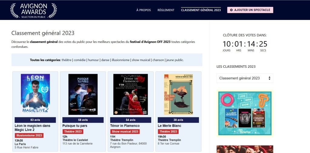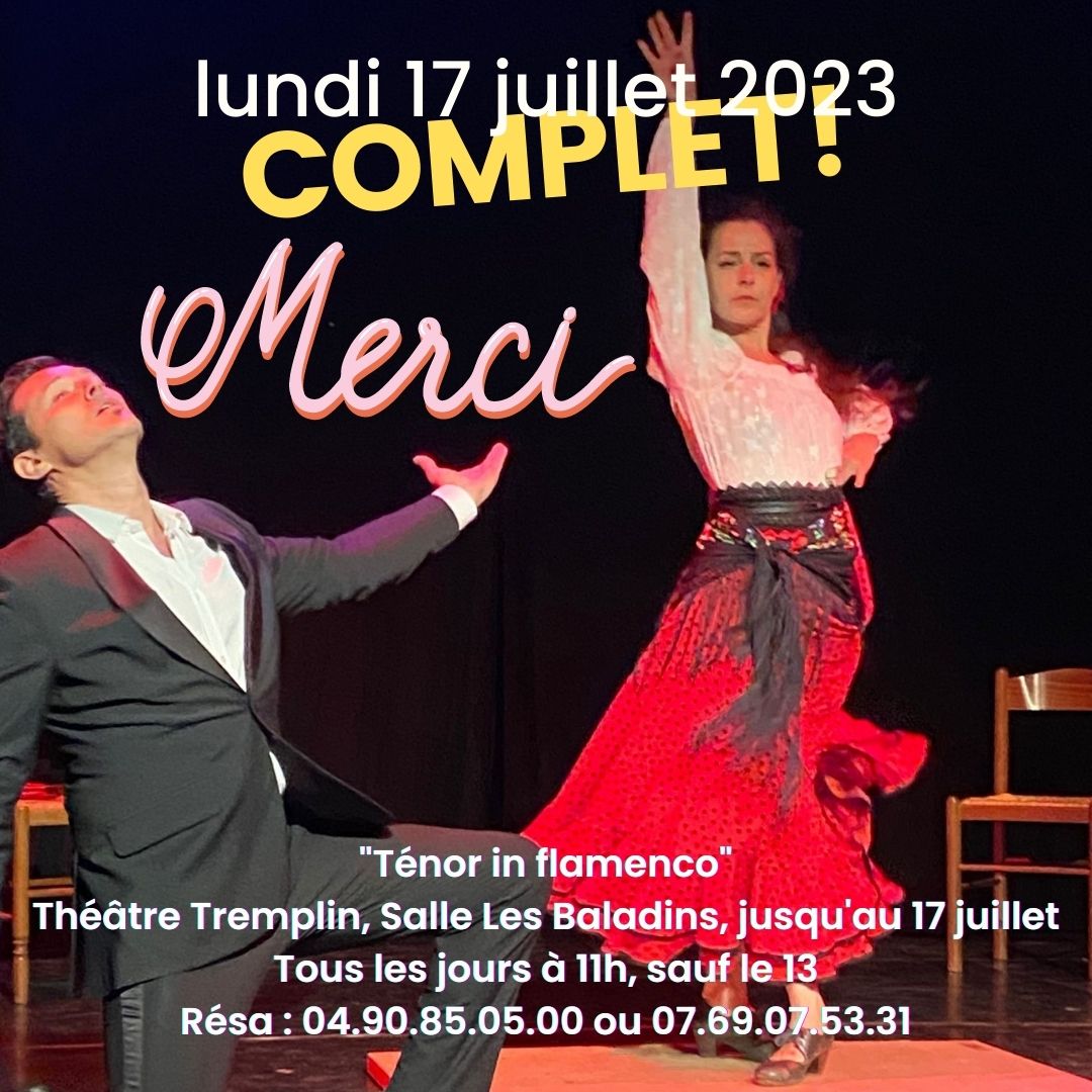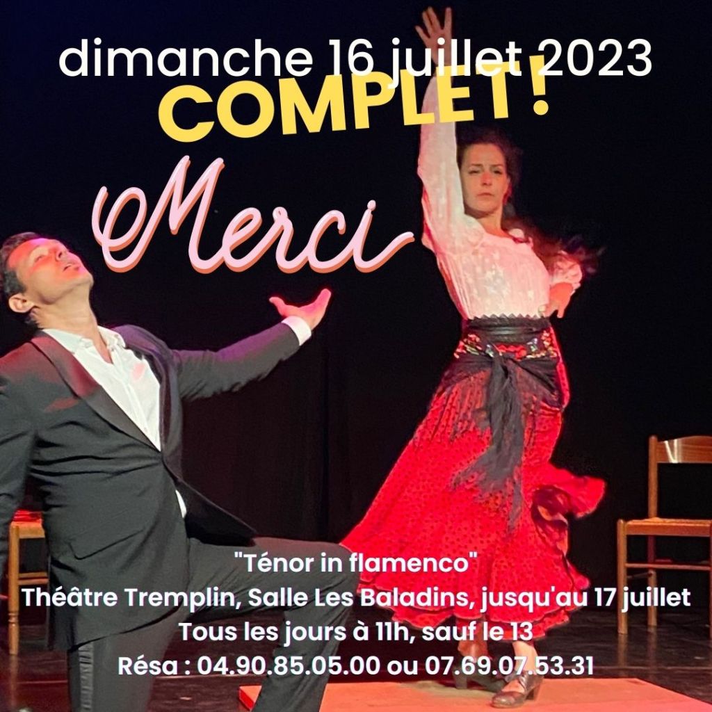 Enfin, le spectacle « Ténor in flamenco » est encore à la 3ème place au classement général du meilleur spectacle du Festival Off d’Avignon 2023 grâce aux votes du public ce mercredi 19 juillet! Rendez-vous sur https://www.avignonawards.com/festival-2023/show-musical-2023/tenor-in-flamenco/. Il reste encore 10 jours pour conserver cette place et même l’améliorer!