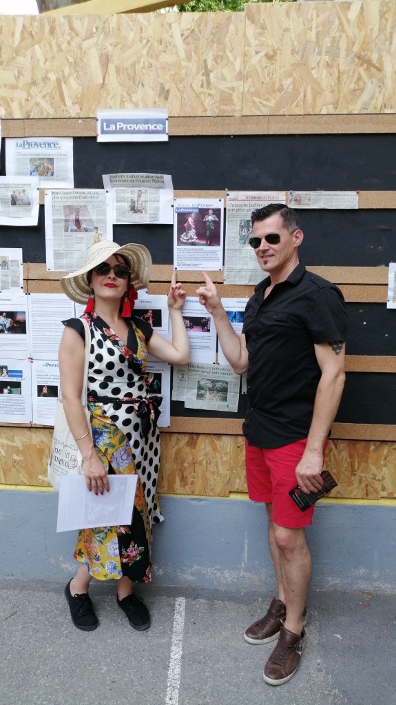 Voici tout d’abord les photos de quelques grands moments : la Grande Parade du Festival Off, la pose d’affiches dans les rues d’Avignon, la pose de l’article du journal « La Provence » au Village du Off, le Ténor et La Loli avec leur public.