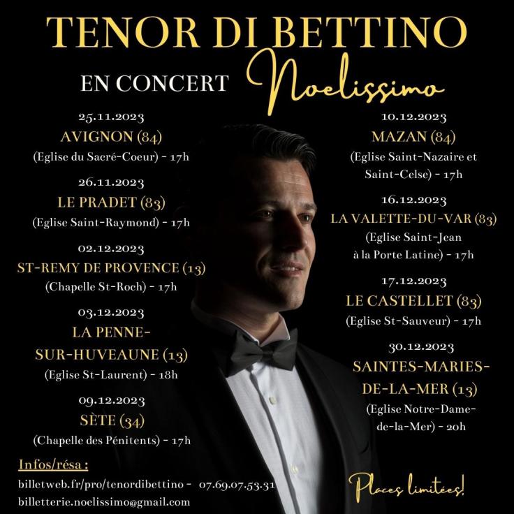 La tournée « Noelissimo » du Ténor Di Bettino dans les églises et chapelles du Sud de la France, ce sont maintenant 9 concerts que vous pouvez réserver! Cette semaine, le Ténor a révélé 2 nouvelles dates dans les Bouches-du-Rhône, à La Penne-sur-Huveaune et aux Saintes-Maries-de-la-Mer. Le planning de tournée intégral est ci-dessous.