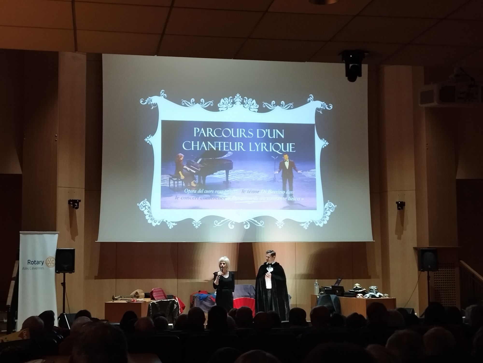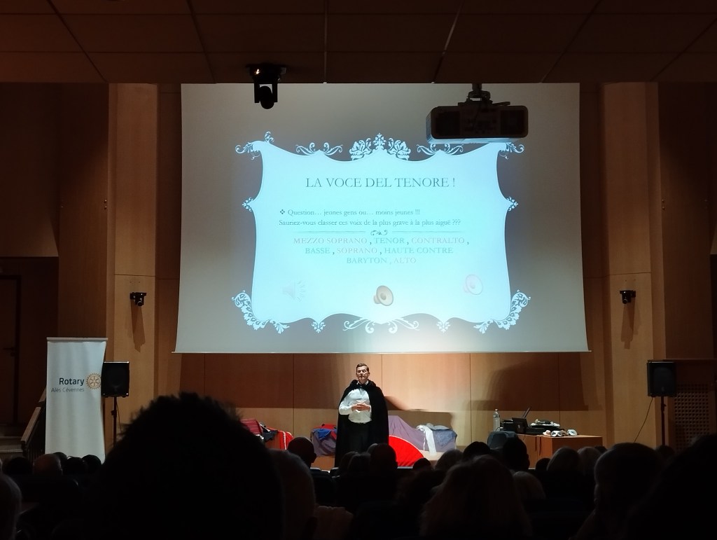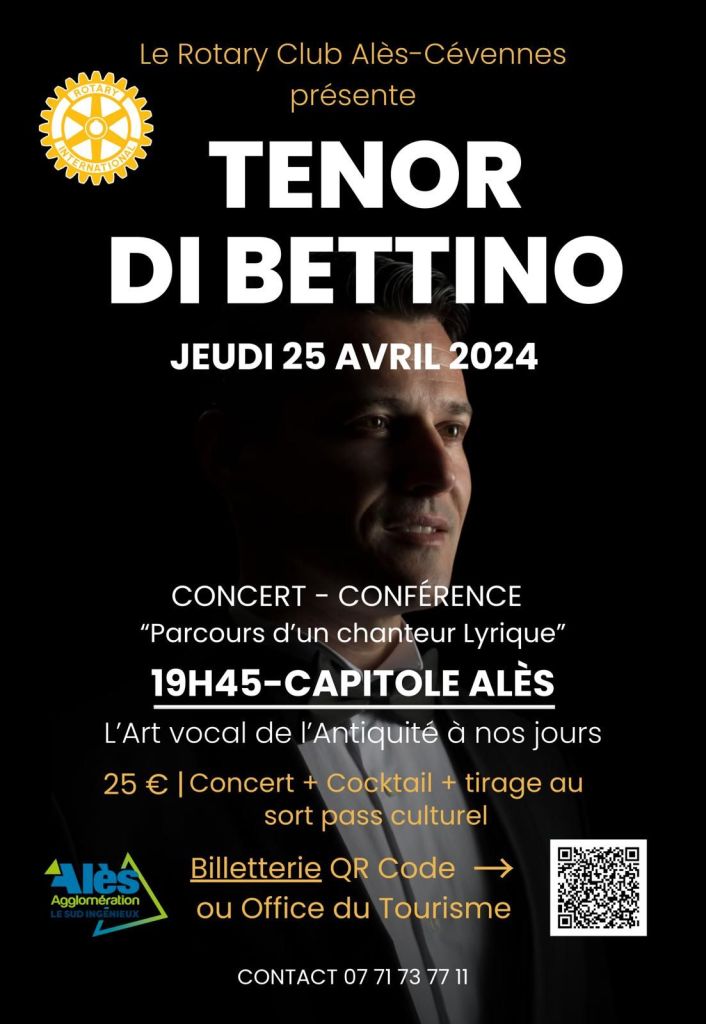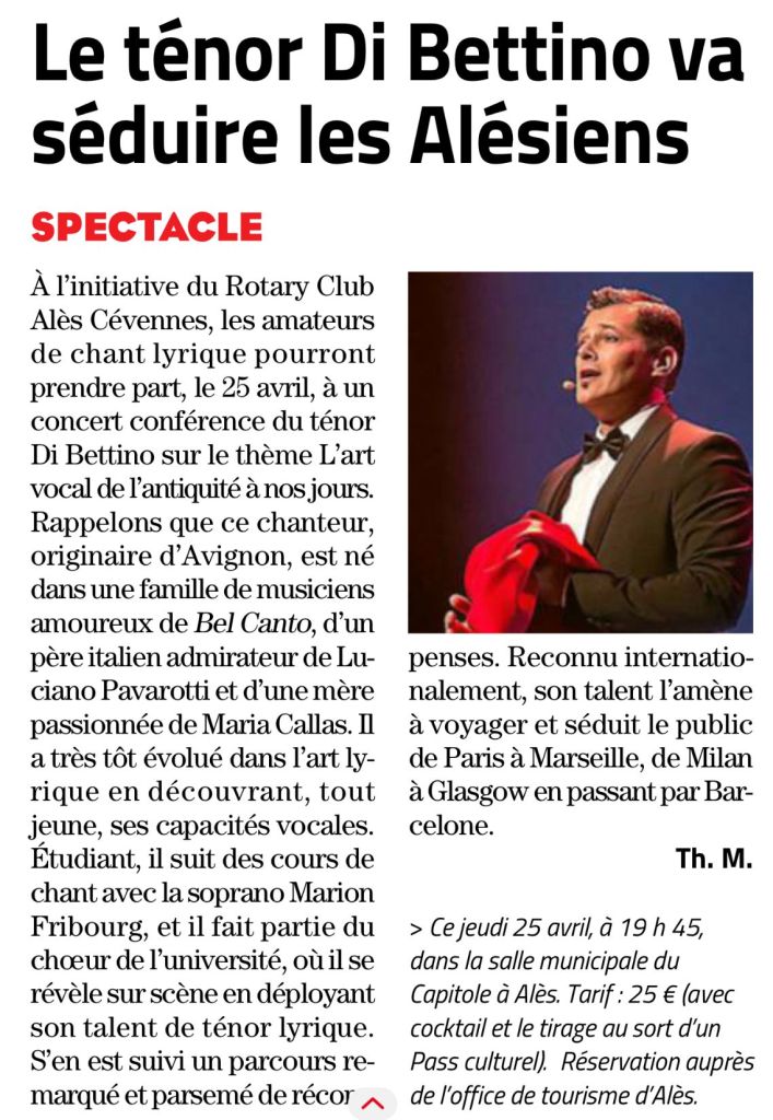C’était une première ce jeudi 25 avril 2024 à Alès, dans le Gard : le Ténor Di Bettino a présenté son concert-conférence « Parcours d’un chanteur lyrique », dans la salle municipale du Capitole. Le public alésien s’est déplacé en nombre pour assister à cet événement, organisé par le Rotary Club Alès-Cévennes.