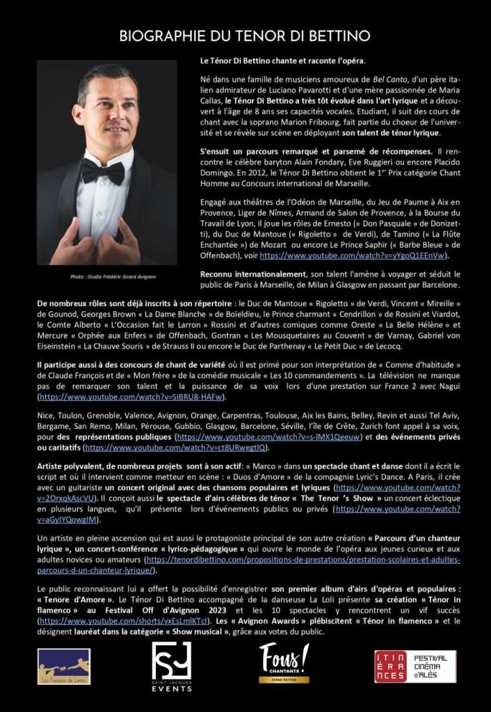 Si vous aussi, vous souhaitez programmer le concert-conférence « Parcours d’un chanteur lyrique » du Ténor Di Bettino dans votre ville, rendez-vous en page CONTACT.