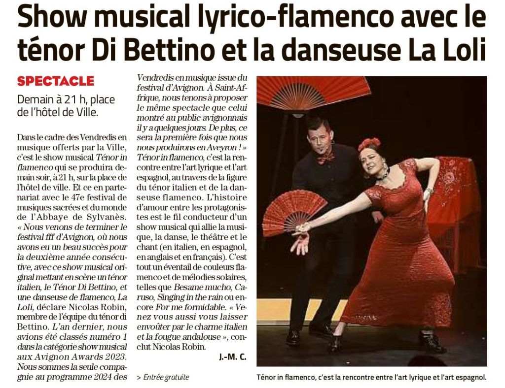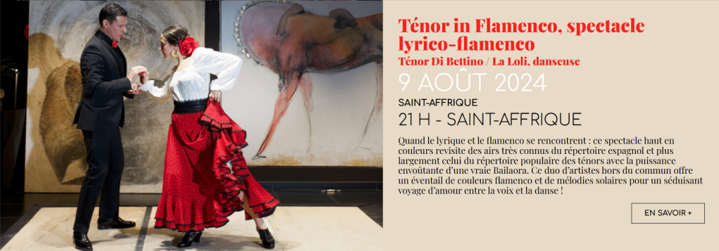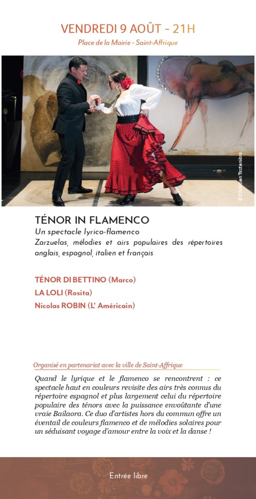 Prochain rendez-vous samedi 17 août à Tarascon (Bouches-du-Rhône) pour « Ténor in flamenco », Place du Marché, face à l’Hôtel de Ville. Et c’est gratuit!