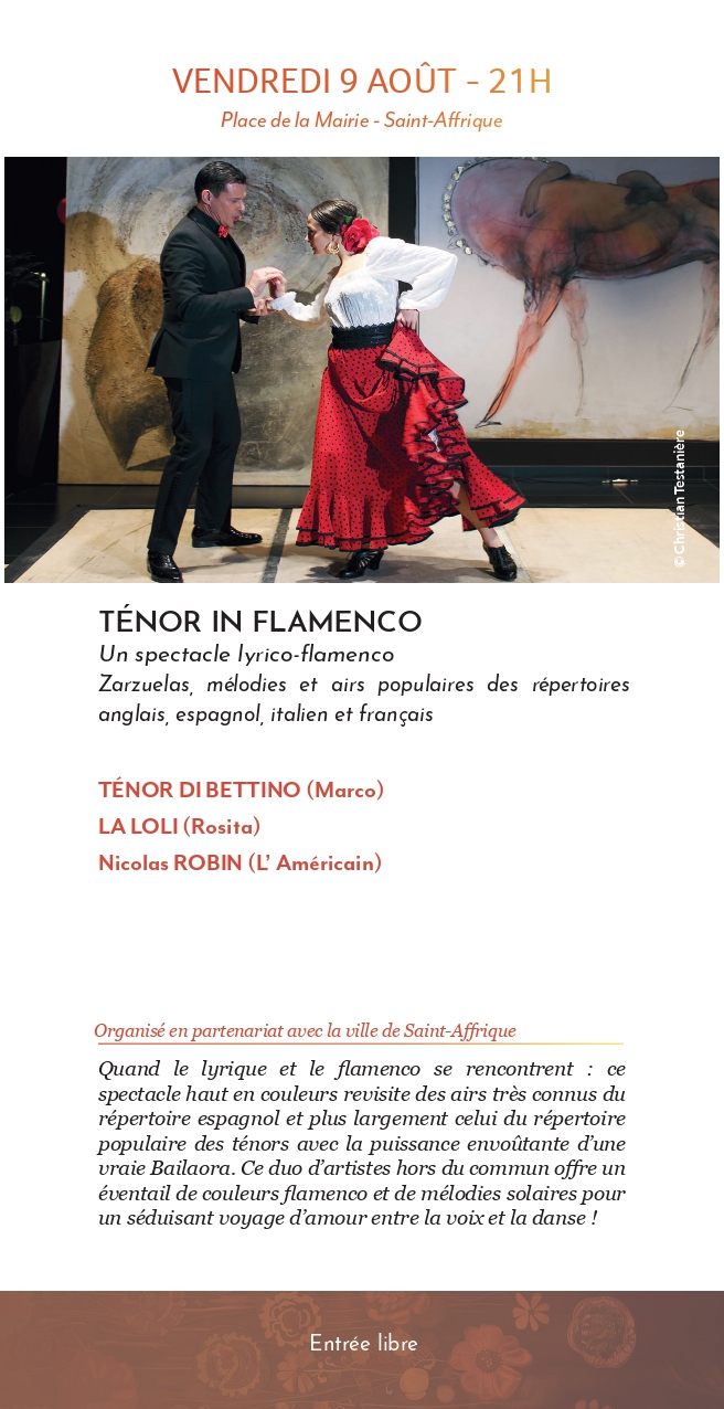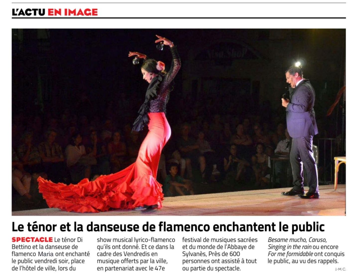 Nous vous annoncions « Ténor in flamenco » pour la première fois dans l’Aveyron, à Saint-Affrique, en partenariat avec l’Abbaye de Sylvanès pour son 47ème Festival « Musiques sacrées, Musiques du Monde ». Près de 600 spectateurs ont assisté à la représentation le 9 août, Place de la Mairie! Retour sur cet évènement en photos, vidéos, articles de presse et plus encore.