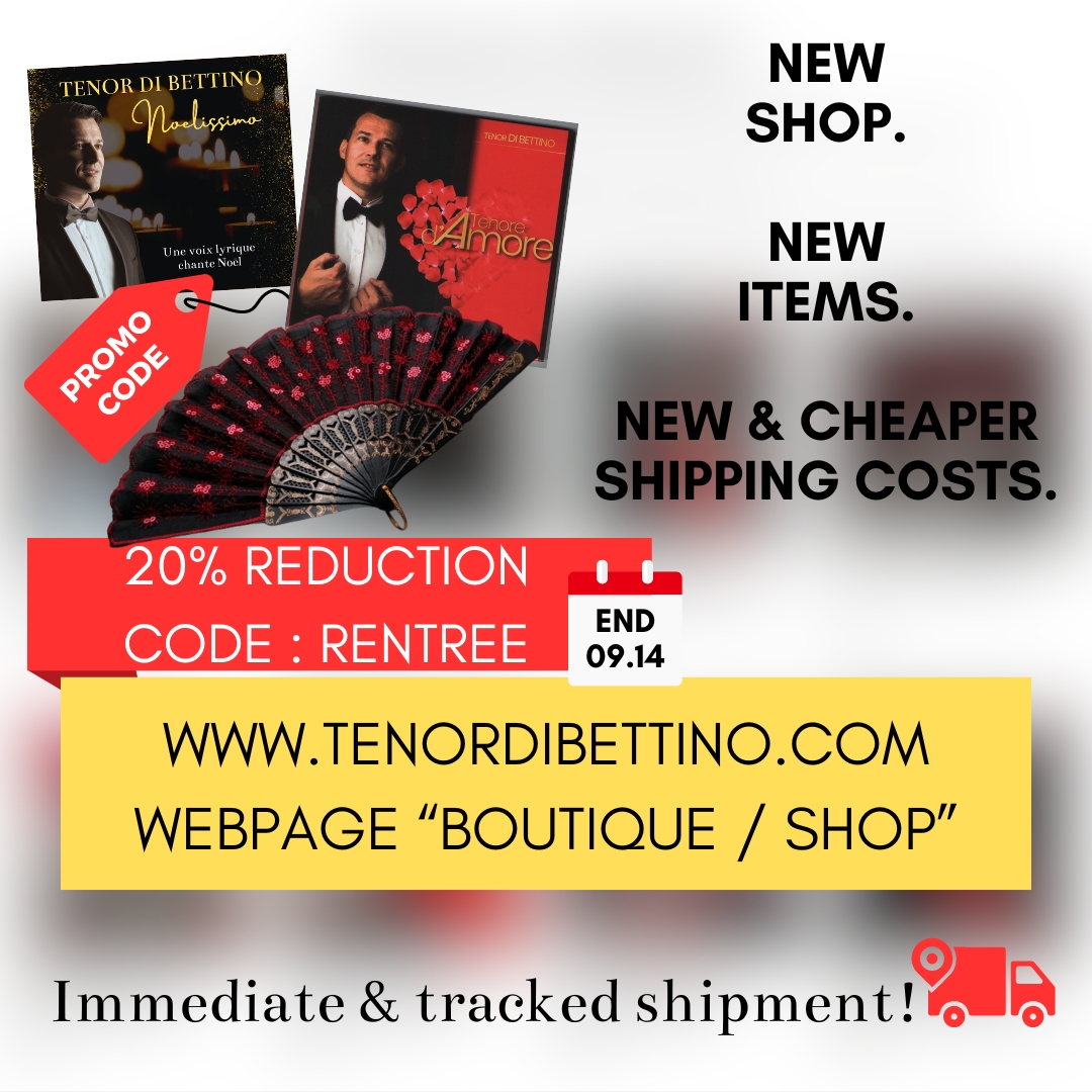 Bonne rentrée à tous! Pour vous donner du baume au coeur, visitez la nouvelle boutique du Ténor Di Bettino où vous pourrez vous procurer les 2 CD studio du Ténor (« Tenore d’amore » et « Noelissimo »), le merchandising du show musical « Ténor in flamenco » et de la tournée « Noelissimo ». Les frais de ports ont été ajustés et la livraison est proposée dans le monde entier.
