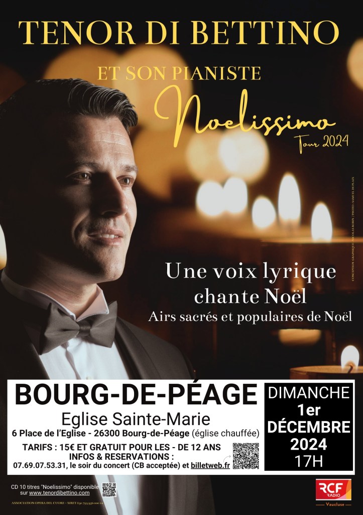 dimanche 1er décembre 2024 : Bourg-de-Péage (26), église Sainte-Marie, 17h. https://www.billetweb.fr/noelissimo-tour-2024-par-le-tenor-di-bettino-a-leglise-sainte-marie-bourg-de-peage-1er-decembre-2024 ou par téléphone : +33.(0)7.69.07.53.31.