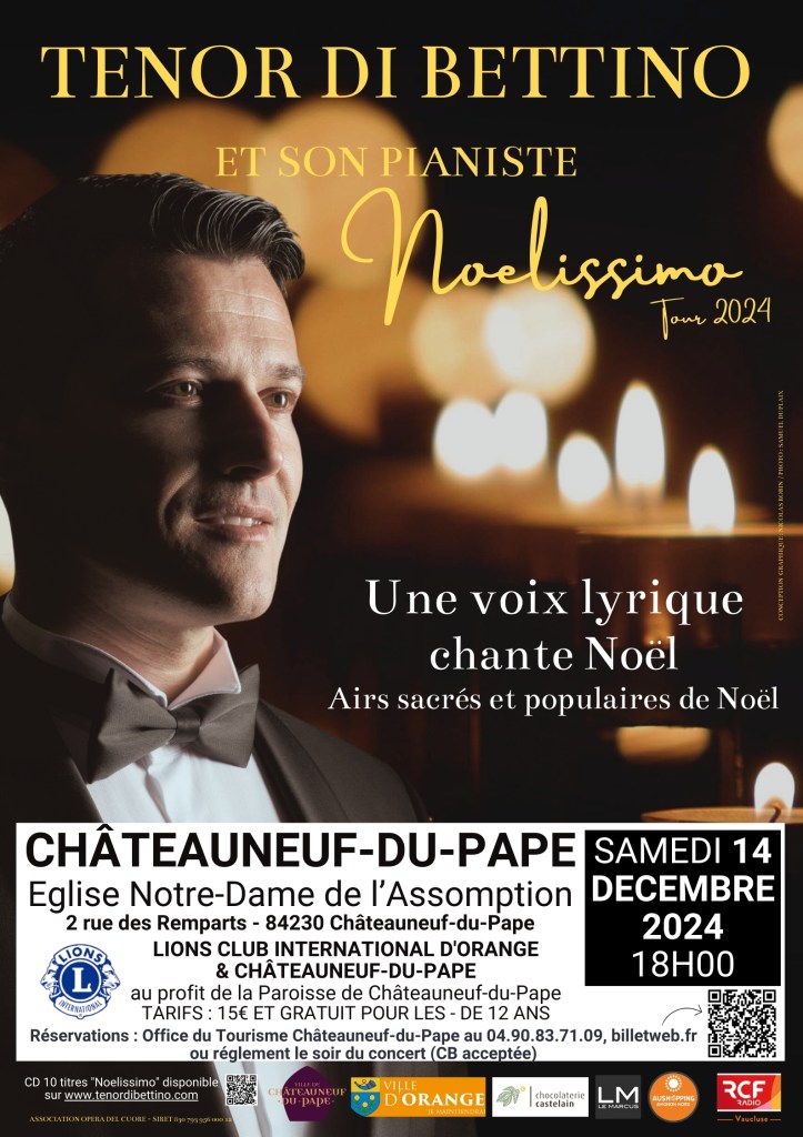 samedi 14 décembre 2024 : Châteauneuf-du-Pape (84), église Notre-Dame de l’Assomption, 18h. https://www.billetweb.fr/concert-du-noel-2024-avec-tenor-di-bettino-et-son-pianiste ou par téléphone : +33.(0)7.69.07.53.31.