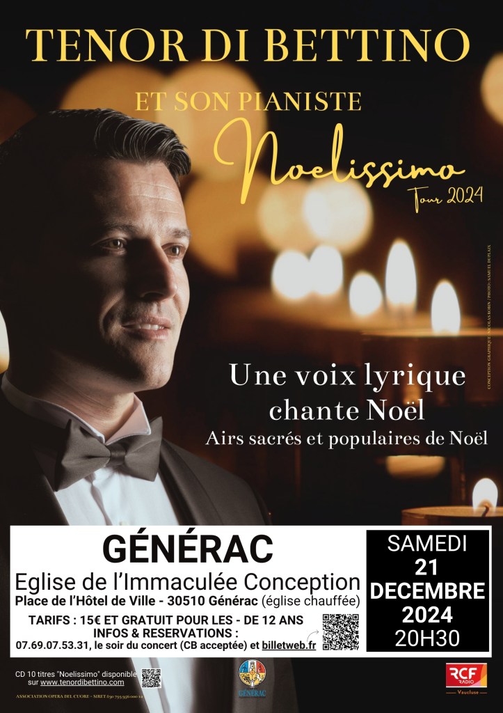 samedi 21 décembre 2024 : Générac (30), église de l’Immaculée Conception, 20h30. https://www.billetweb.fr/noelissimo-par-le-tenor-di-bettino-en-leglise-de-limmaculee-conception-generac-30 ou par téléphone : +33.(0)7.69.07.53.31.