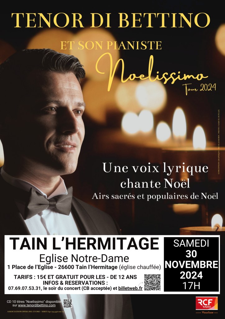 samedi 30 novembre 2024 : Tain L’Hermitage (26), église Notre-Dame, 17h. https://www.billetweb.fr/noelissimo-tour-2024-par-le-tenor-di-bettino-a-leglise-du-prieure-de-tain-tain-lhermitage-30-novembre-2024 ou par téléphone : +33.(0)7.69.07.53.31.