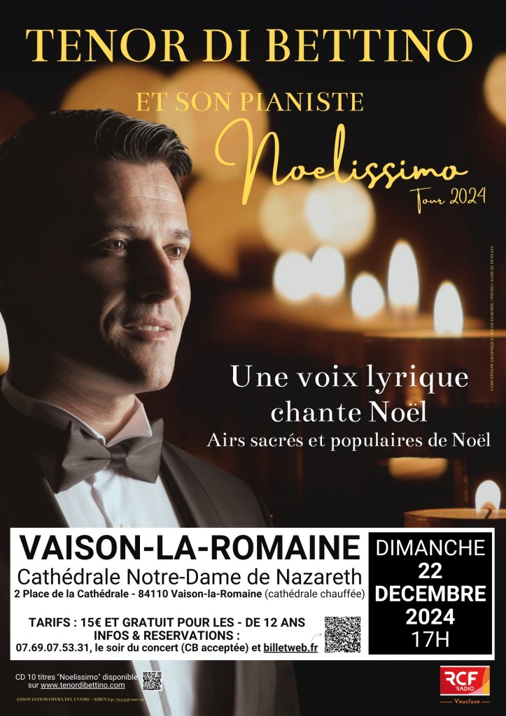 dimanche 22 décembre 2024 : Vaison-la-Romaine (84), cathédrale Notre-Dame de Nazareth, 17h. https://www.billetweb.fr/noelissimo-tour-2024-par-le-tenor-di-bettino-a-la-cathedrale-notre-dame-de-nazareth-vaison-la-romaine-22-decembre-2024 ou par téléphone : +33.(0)7.69.07.53.31.