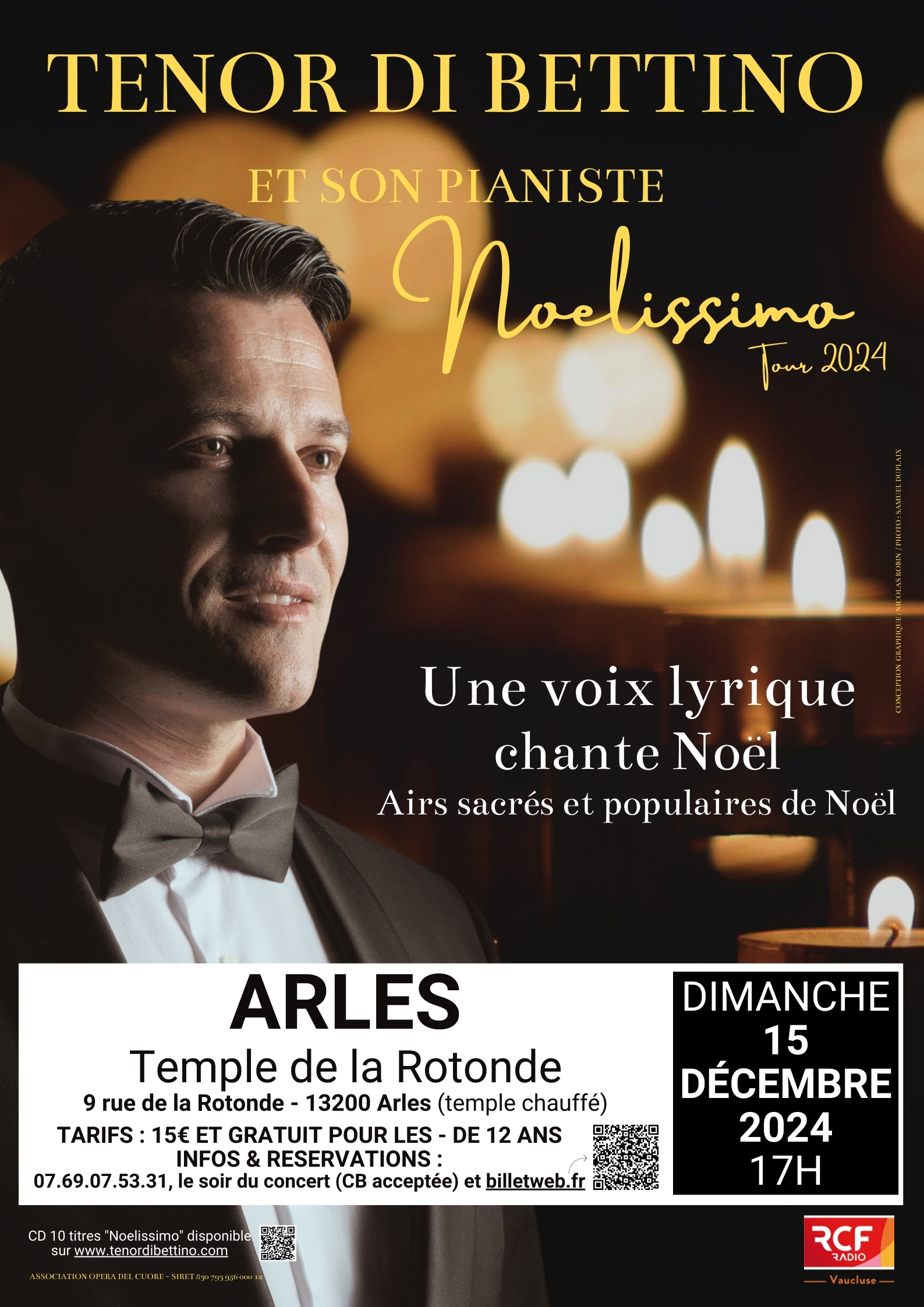 dimanche 15 décembre 2024 : Arles (13), Temple de la Rotonde, 17h. https://www.billetweb.fr/noelissimo-tour-2024-par-le-tenor-di-bettino-au-temple-de-la-rotonde-arles-15-decembre-2024 ou par téléphone : +33.(0)7.69.07.53.31.
