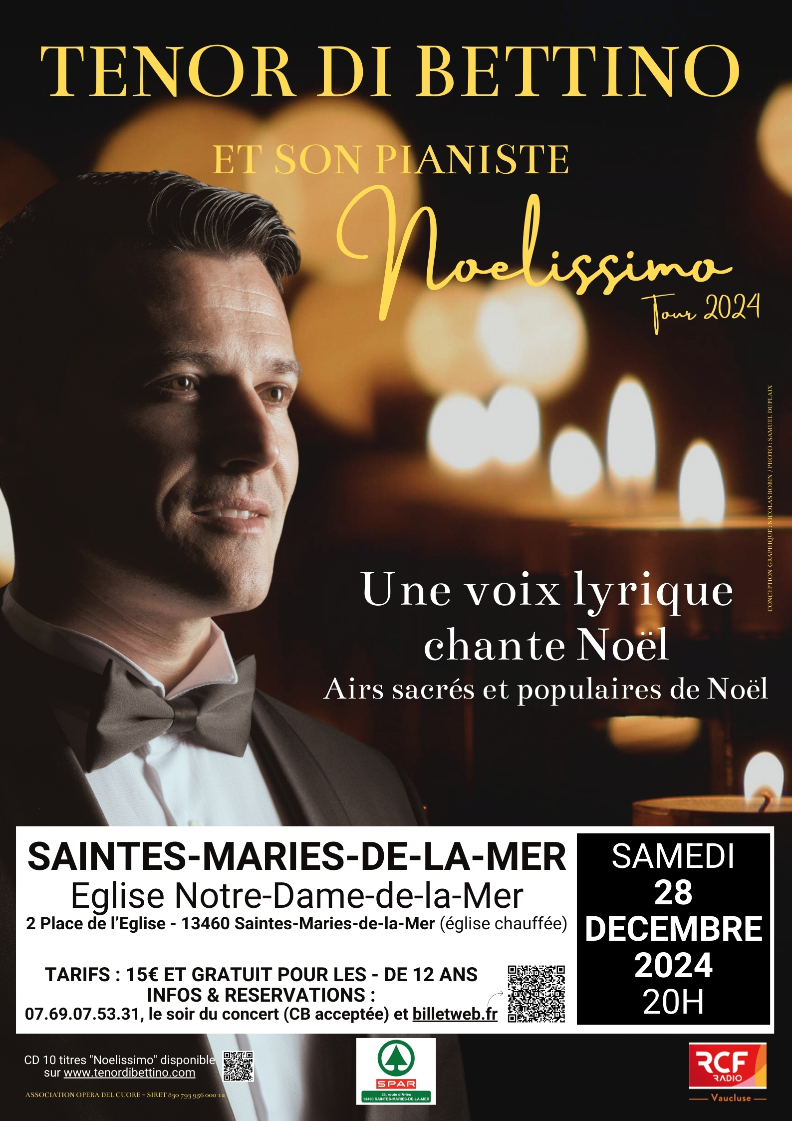 samedi 28 décembre 2024 : Saintes-Maries-de-la-Mer (13), église Notre-Dame-de-la-Mer, 20h. https://www.billetweb.fr/noelissimo-tour-2024-par-le-tenor-di-bettino-a-leglise-notre-dame-de-la-mer-saintes-maries-de-la-mer-28-decembre-2024 ou par téléphone : +33.(0)7.69.07.53.31.