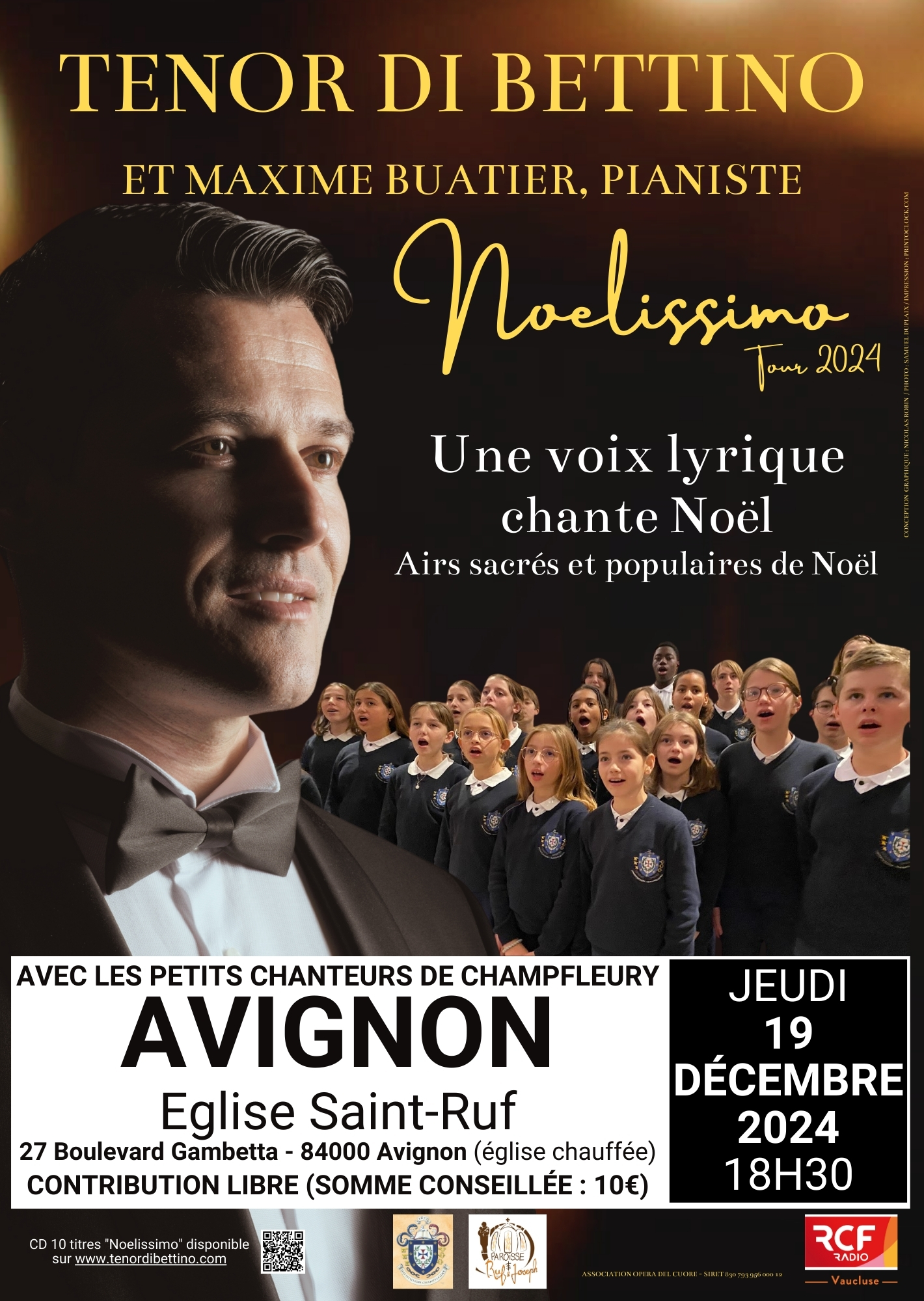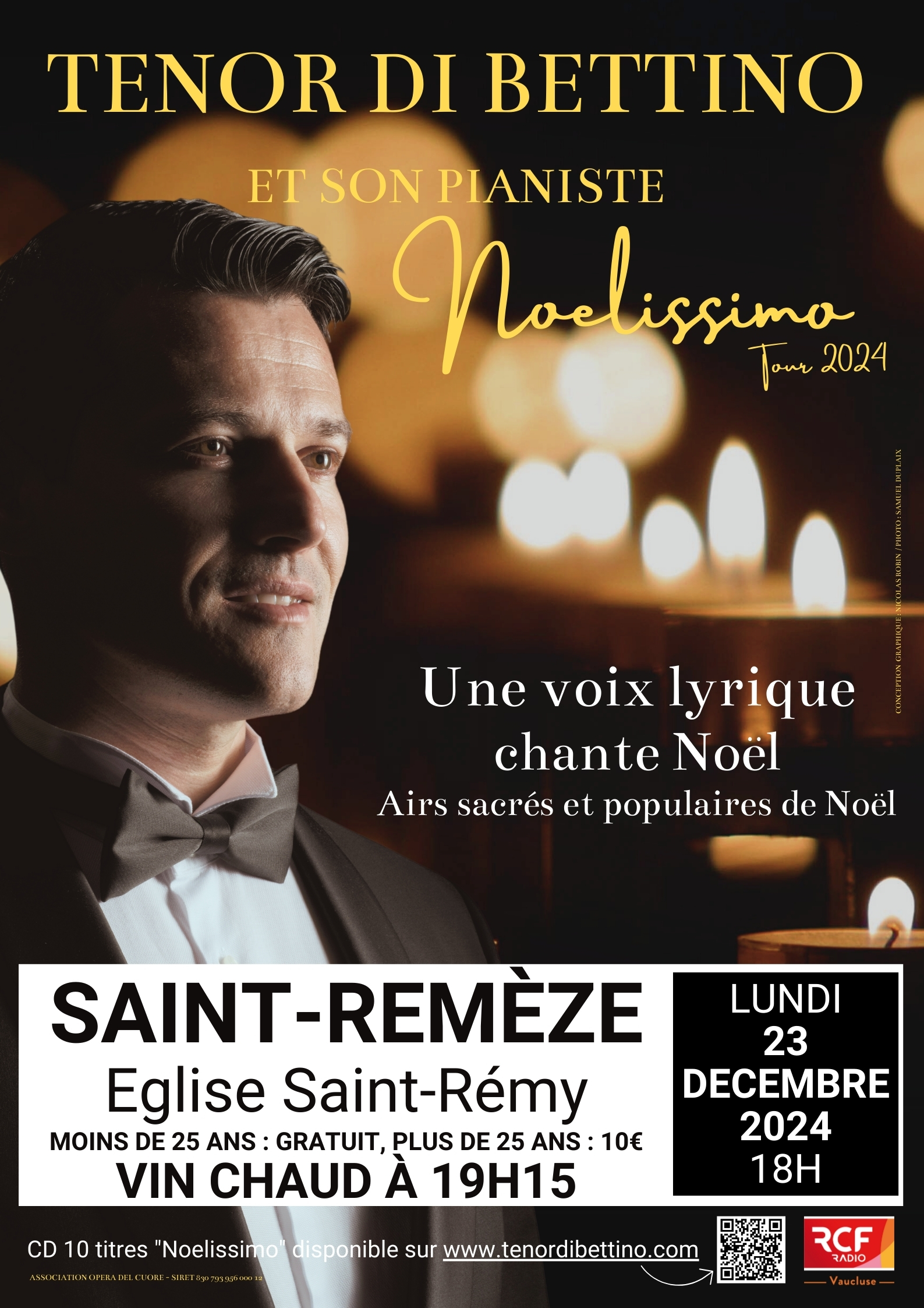 dimanche 22 décembre 2024 : Vaison-la-Romaine (84), cathédrale Notre-Dame de Nazareth, 17h. https://www.billetweb.fr/noelissimo-tour-2024-par-le-tenor-di-bettino-a-la-cathedrale-notre-dame-de-nazareth-vaison-la-romaine-22-decembre-2024 ou par téléphone : +33.(0)7.69.07.53.31.