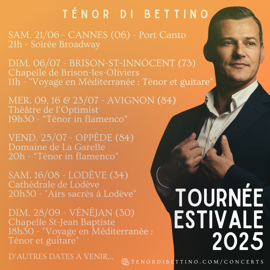 Cette semaine, le Ténor Di Bettino vous a révélé les rendez-vous de l’été 2025. Découvrez dès maintenant la Tournée estivale du Ténor : Festival d’Avignon, festivals lyriques, spectacles… D’autres dates sont à venir, restez donc connectés sur https://tenordibettino.com/concerts/!