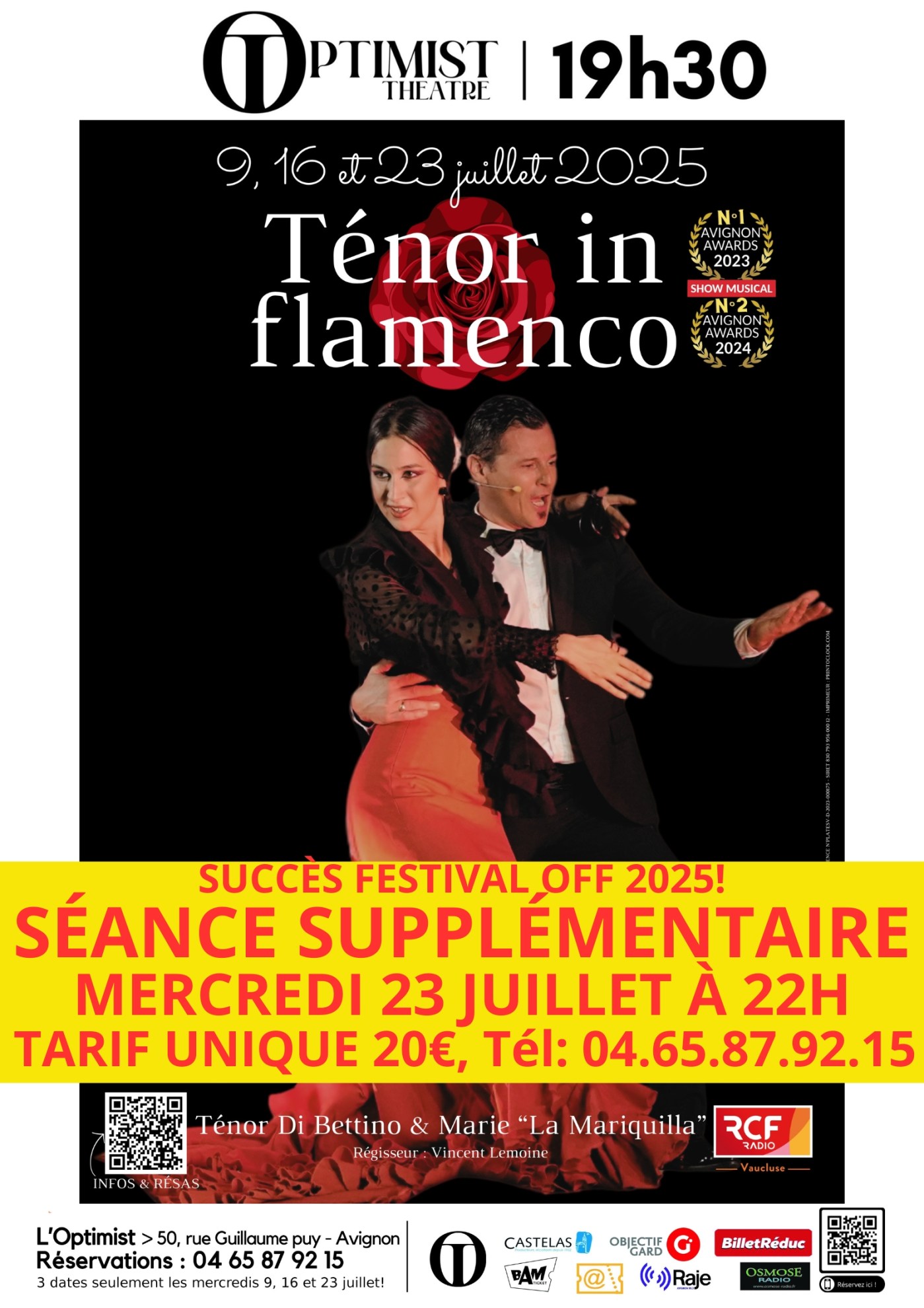 Suite au succès des 3 séances complètes au Festival Off d’Avignon et à la demande croissante du public, une séance supplémentaire de « Ténor in flamenco » aura lieu mercredi 23 juillet à 22h, toujours au Théâtre de l’Optimist!
