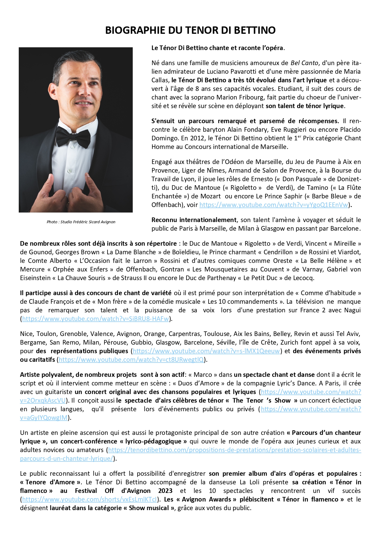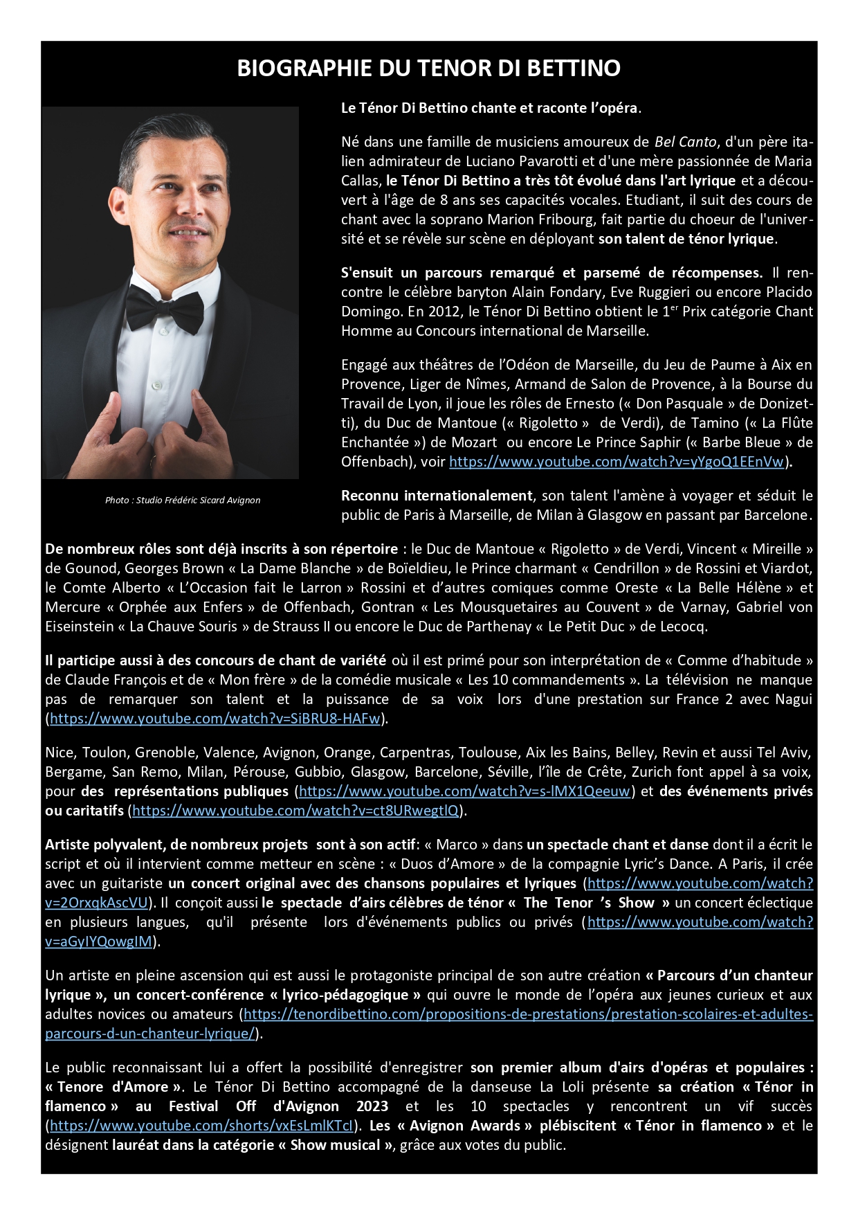 Le public reconnaissant lui a offert la possibilité d’enregistrer son premier album d’Airs d’opéras et populaires : « Tenore d’Amore » (https://tenordibettino.com/). Le Ténor Di Bettino accompagné de la danseuse La Loli présente sa création « Ténor in flamenco » au Festival Off d’Avignon 2023 et les 10 spectacles y rencontrent un vif succès (https://www.youtube.com/shorts/vxEsLmlKTcI). Les « Avignon Awards » plébiscitent « Ténor in flamenco » et le désignent lauréat dans la catégorie « Show musical », grâce aux votes du public.