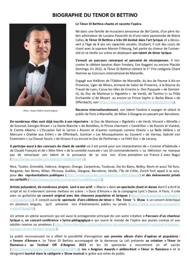 Né dans une famille de musiciens amoureux de Bel Canto, d’un père italien admirateur de Luciano Pavarotti et d’une mère passionnée de Maria Callas, le Ténor Di Bettino a très tôt évolué dans l’art lyrique et a découvert à l’âge de 8 ans ses capacités vocales. Etudiant, il suit des cours de chant avec la soprano Marion Fribourg, fait partie du choeur de l’université et se révèle sur scène en déployant son talent de ténor lyrique.