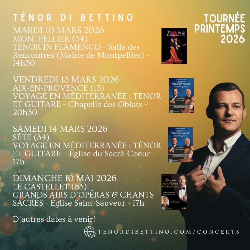 Ci-dessous, les concerts à venir du Ténor Di Bettino (mise à jour 28/01/2026).