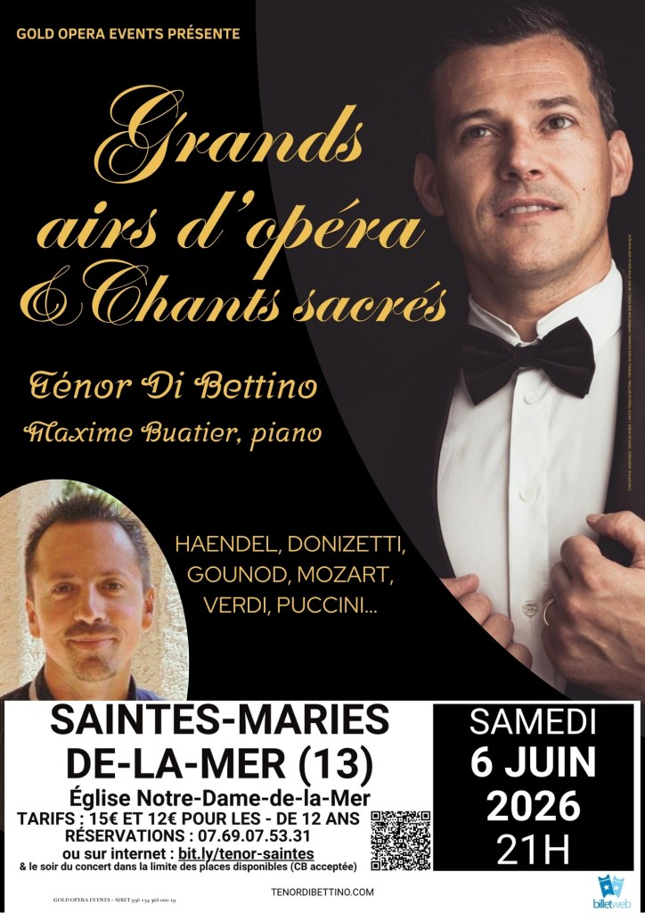 Infos & réservations : https://www.billetweb.fr/grands-airs-dopera-et-chants-sacres-tenor-di-bettino-eglise-des-saintes-maries-de-la-mer-13 ou bit.ly/tenor-saintes et par téléphone 07.69.07.53.31.
