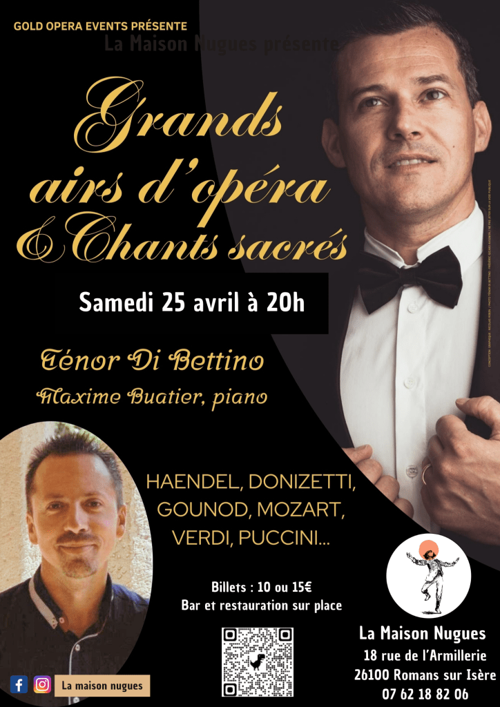 SAMEDI 25 AVRIL 2026 – ROMANS-SUR-ISÈRE (26) – LA MAISON NUGUES – « GRANDS AIRS D’OPÉRA ET CHANTS SACRÉS » (Ténor Di Bettino & Maxime Buatier, pianiste) – 20H.