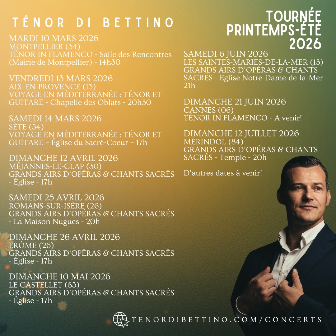 Ci-dessous, les concerts à venir du Ténor Di Bettino (mise à jour 24/02/2026).
