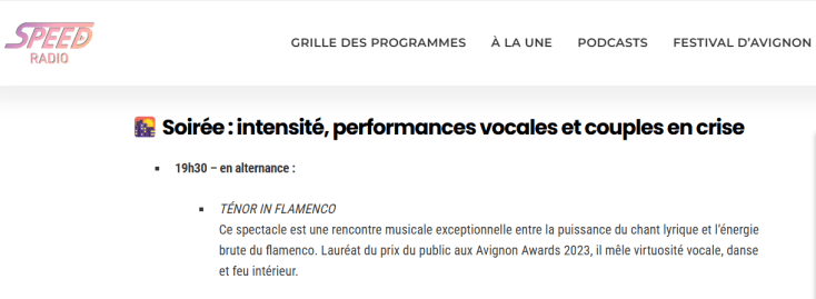 La revue de presse du spectacle « Ténor in flamenco » au Festival d’Avignon #OFF25 (presse écrite et internet, radios) est sur cette page. D’autres ressources sont sur nos pages des réseaux sociaux :