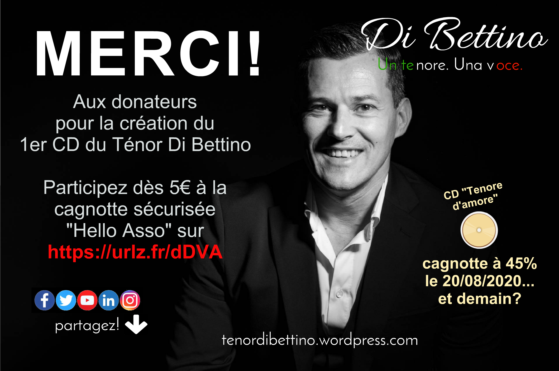 Le 27 février dernier, le Ténor Di Bettino lançait sa cagnotte « crowdfunding » pour participer à la création de son CD « Tenor d’amore ». Malgré le confinement, la cagnotte n’a cessé d’augmenter grâce à vous (un GRAND merci!) et nous sommes presque à mi-chemin : la cagnotte est arrivée à 45%!