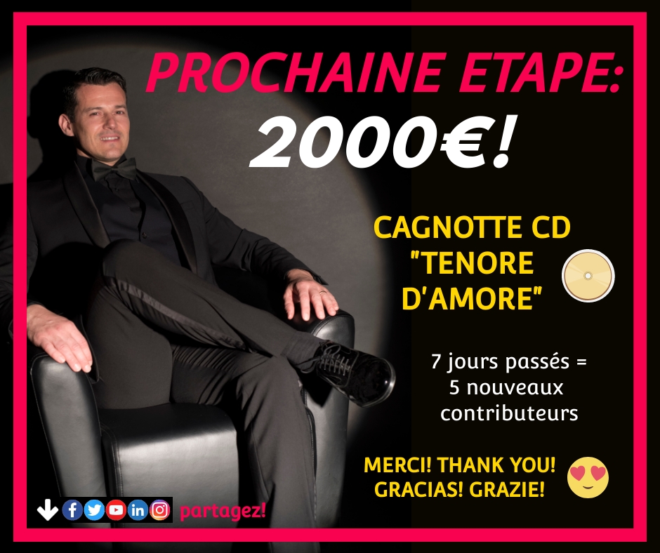 Nous voici à mi-chemin. Grâce à vous, la cagnotte du CD « Tenore d’amore » augmente et en est à 65%! Le Ténor Di Bettino est en ce moment en train de choisir le studio dans lequel il enregistrera prochainement son CD. Un GRAND merci à toutes et tous de l’accompagner jusqu’au terme de la cagnotte, le 18 avril. Toute participation financière du public, aussi modeste soit-elle, est bienvenue!