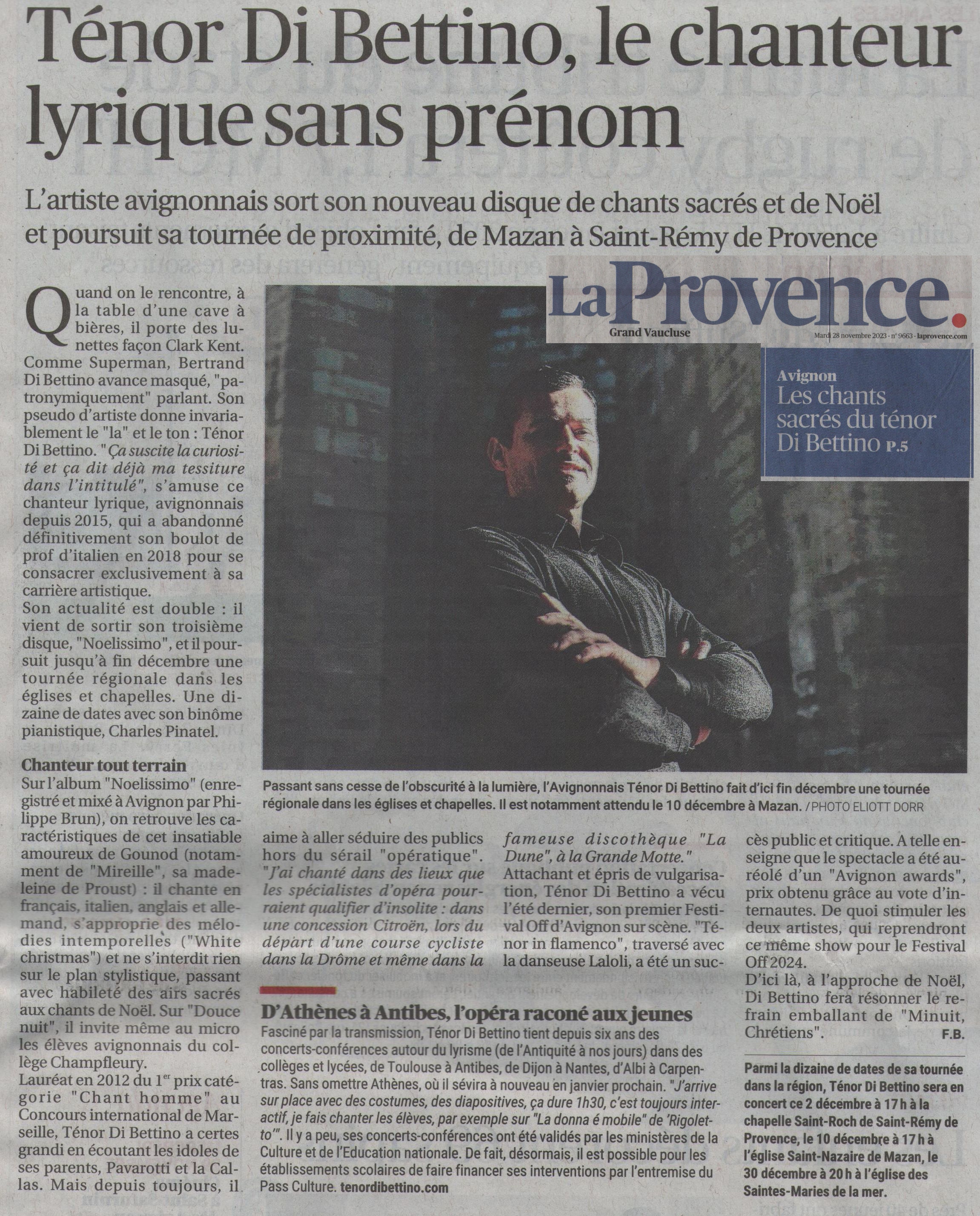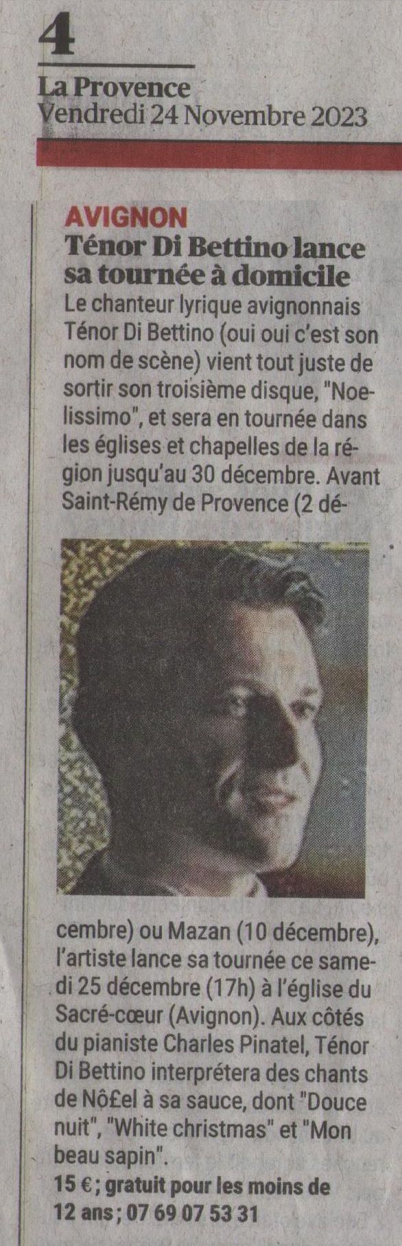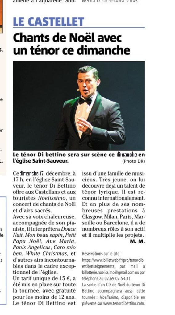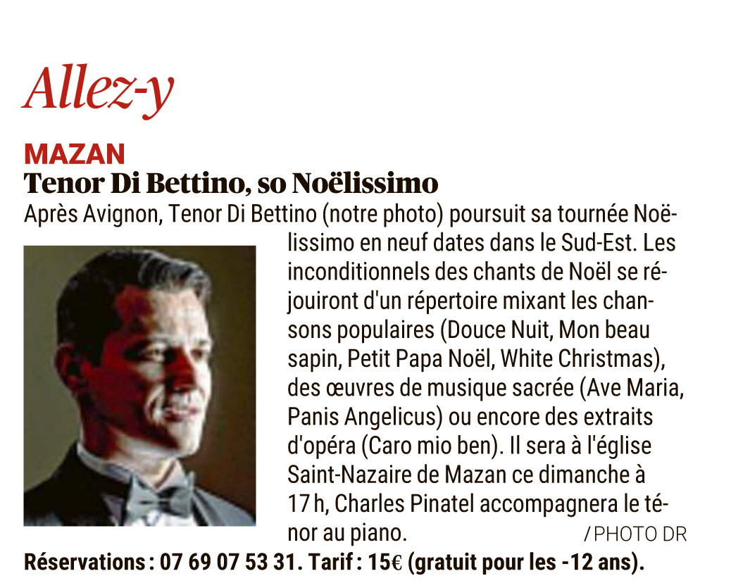 Le Ténor Di Bettino présente « son » Vaucluse et évoque son concert « Noelissimo » à Mazan le 10 décembre 2023 sur les ondes de France Bleu Vaucluse. –