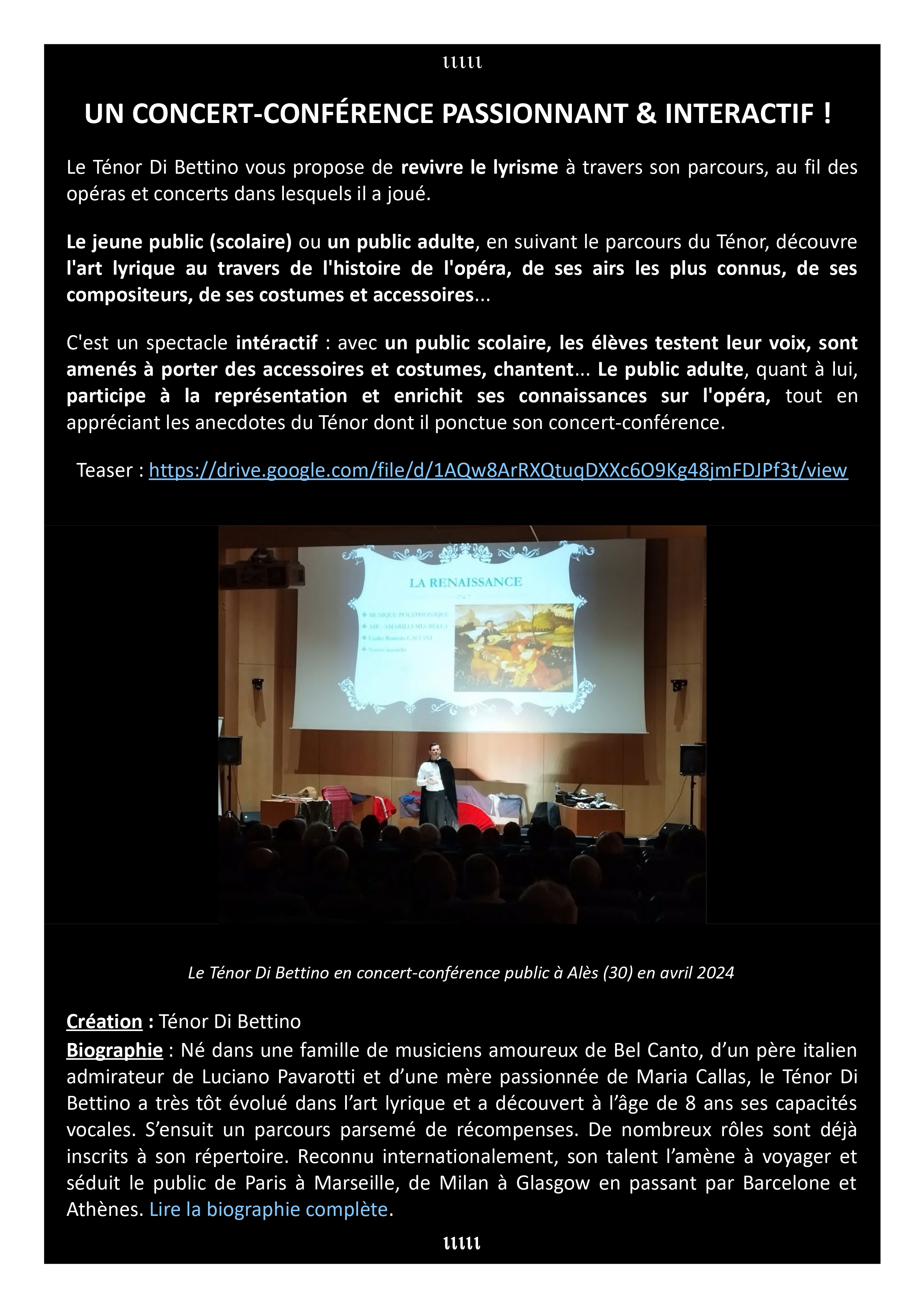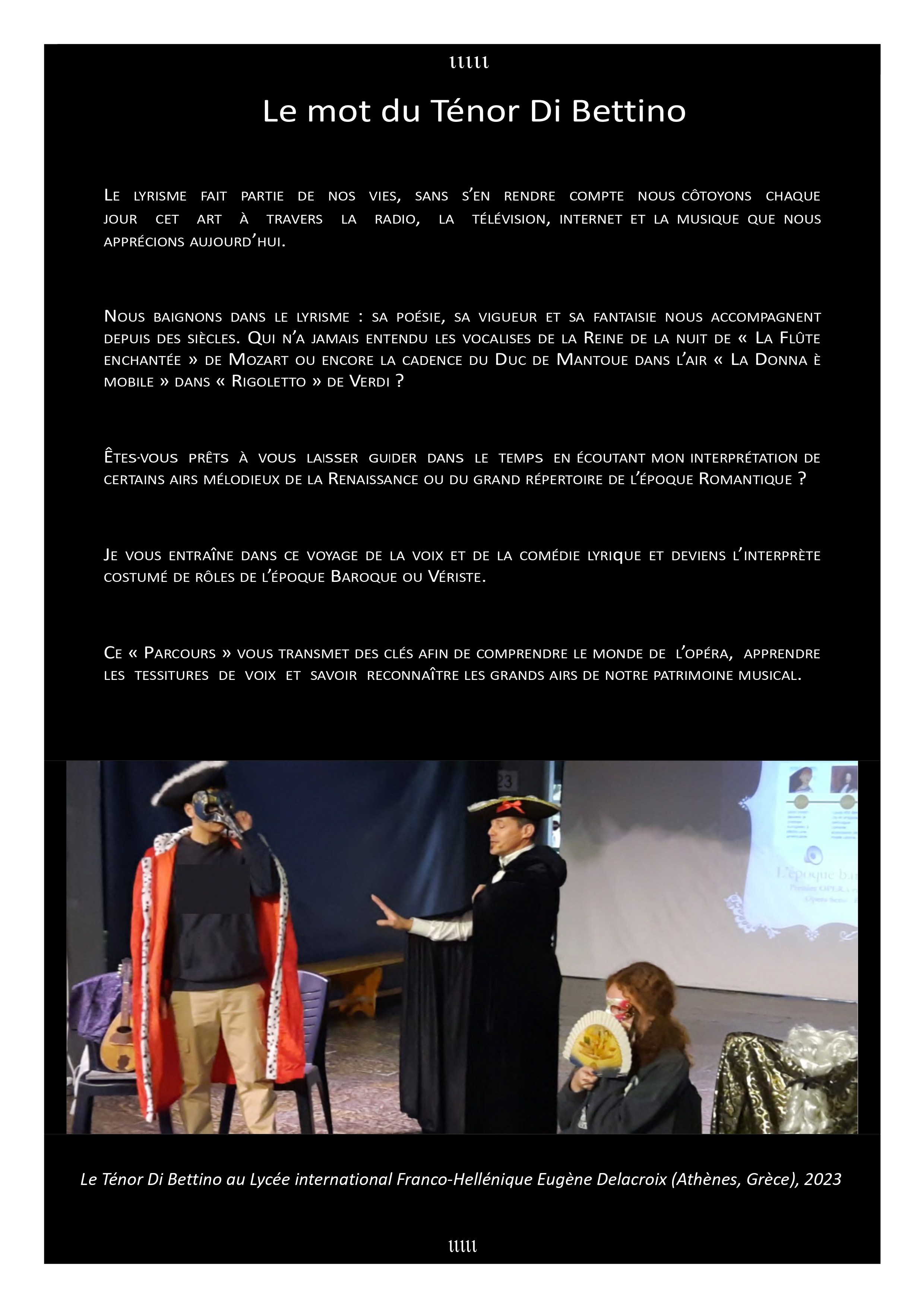 Le Ténor Di Bettino vous propose de revivre le lyrisme à travers son parcours, au fil des opéras et concerts dans lesquels il a joué.