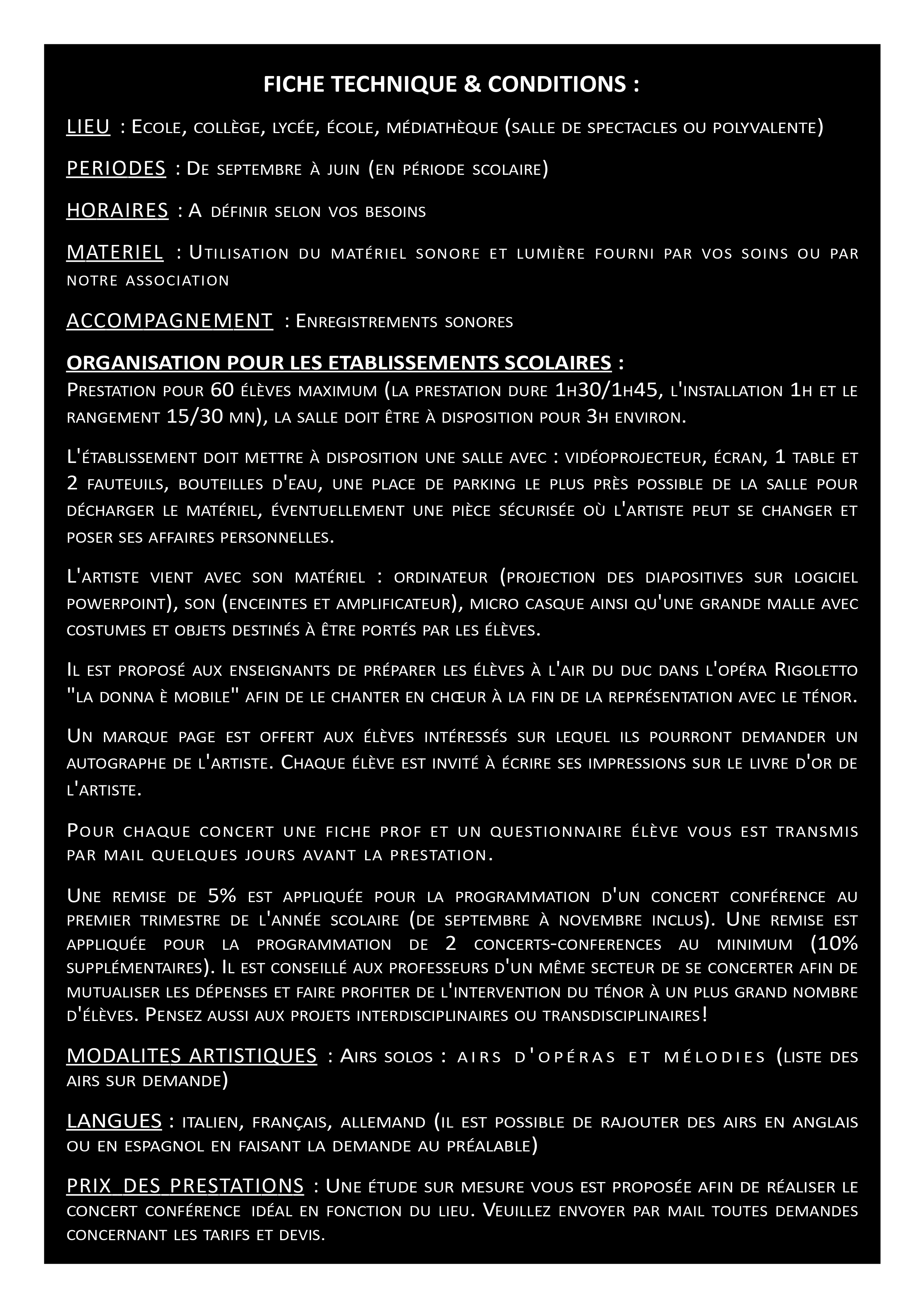 Le jeune public (scolaire) ou un public adulte, en suivant le parcours du Ténor, découvre l’art lyrique au travers de l’histoire de l’opéra, de ses airs les plus connus, de ses compositeurs, de ses costumes et accessoires…