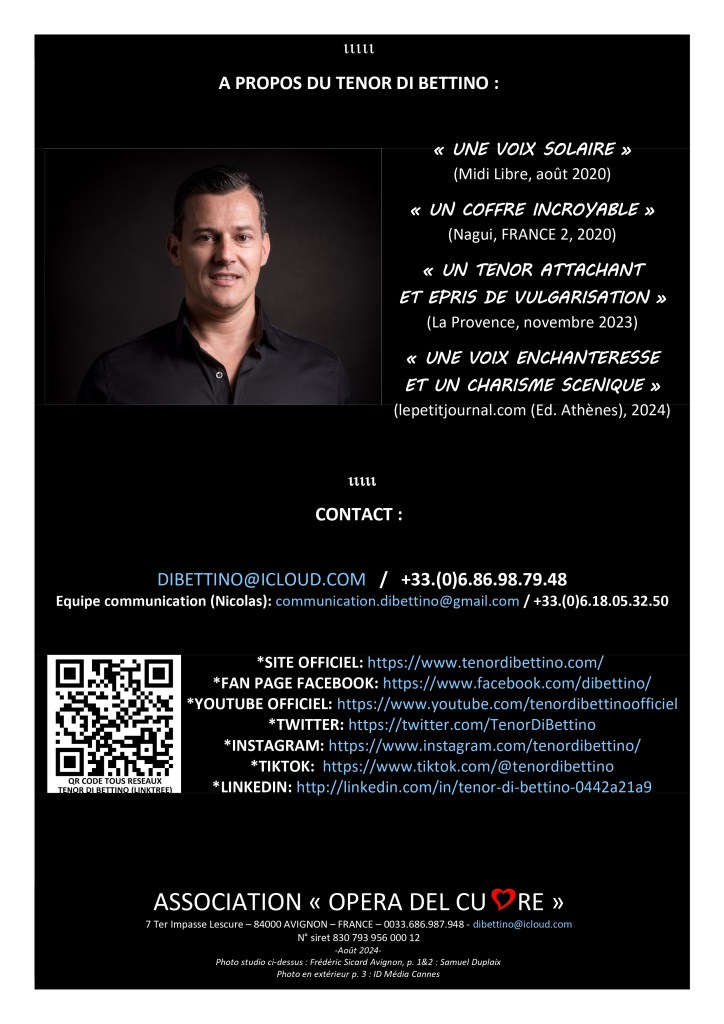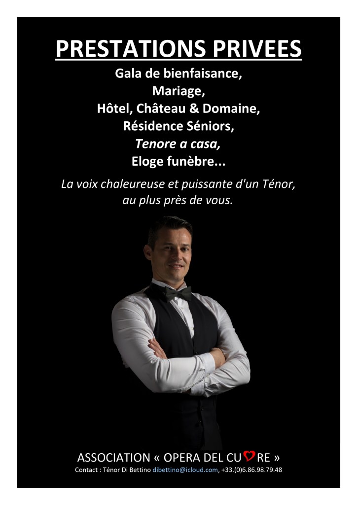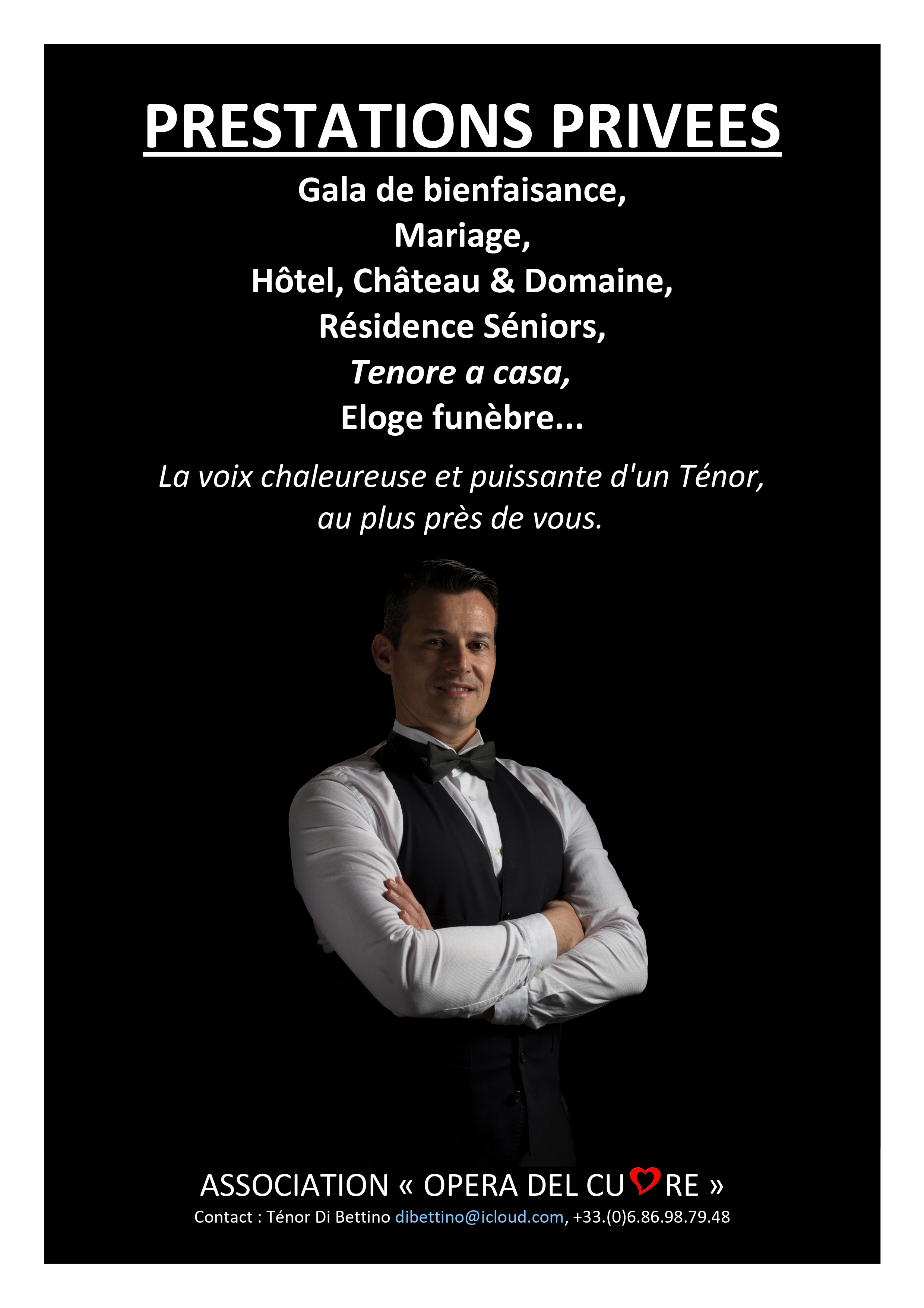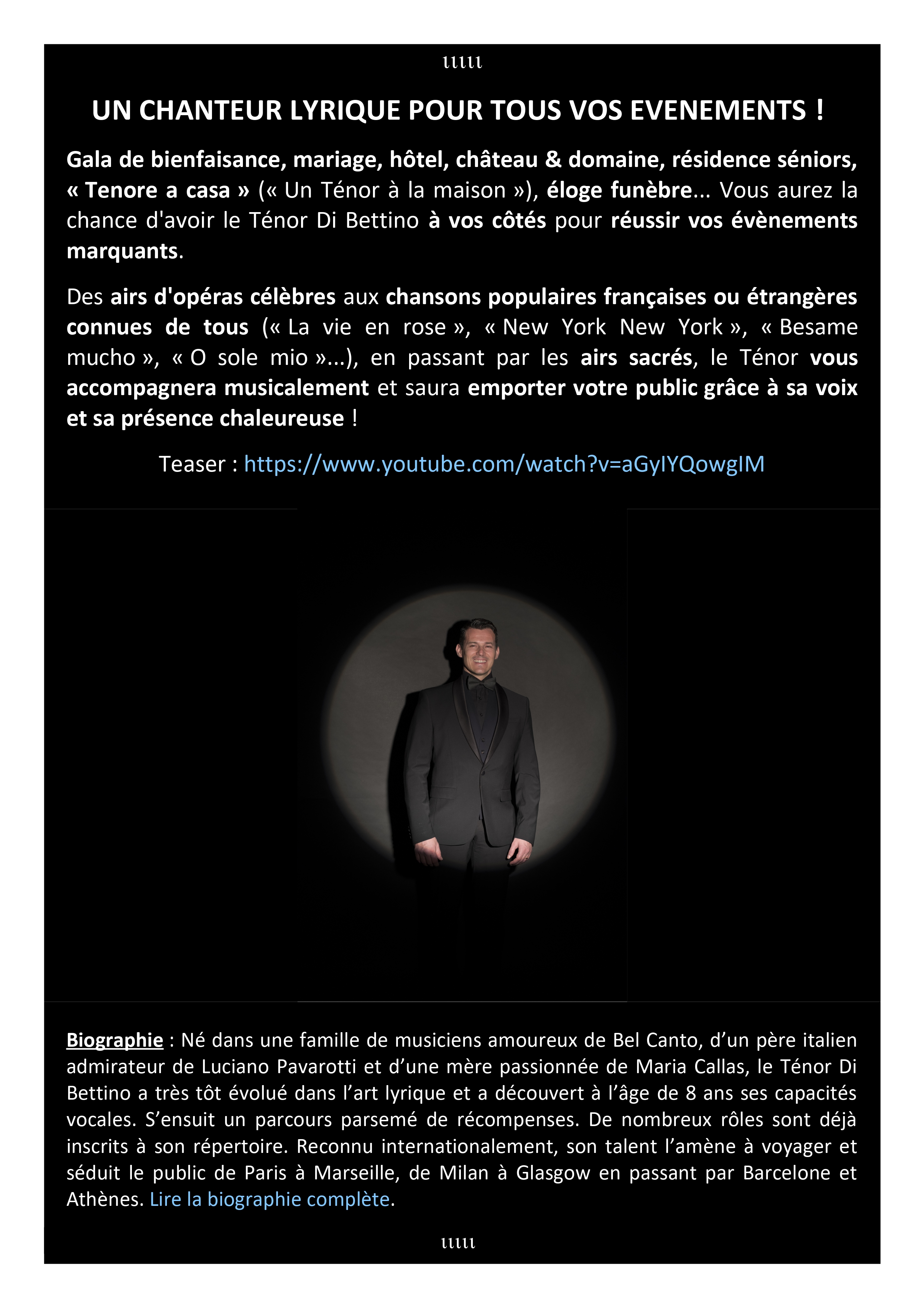 Gala de bienfaisance, mariage, hôtel, château & domaine, résidence séniors, « Tenore a casa » (« Un Ténor à la maison »), éloge funèbre… Vous aurez la chance d’avoir le Ténor Di Bettino à vos côtés pour réussir vos évènements marquants.
