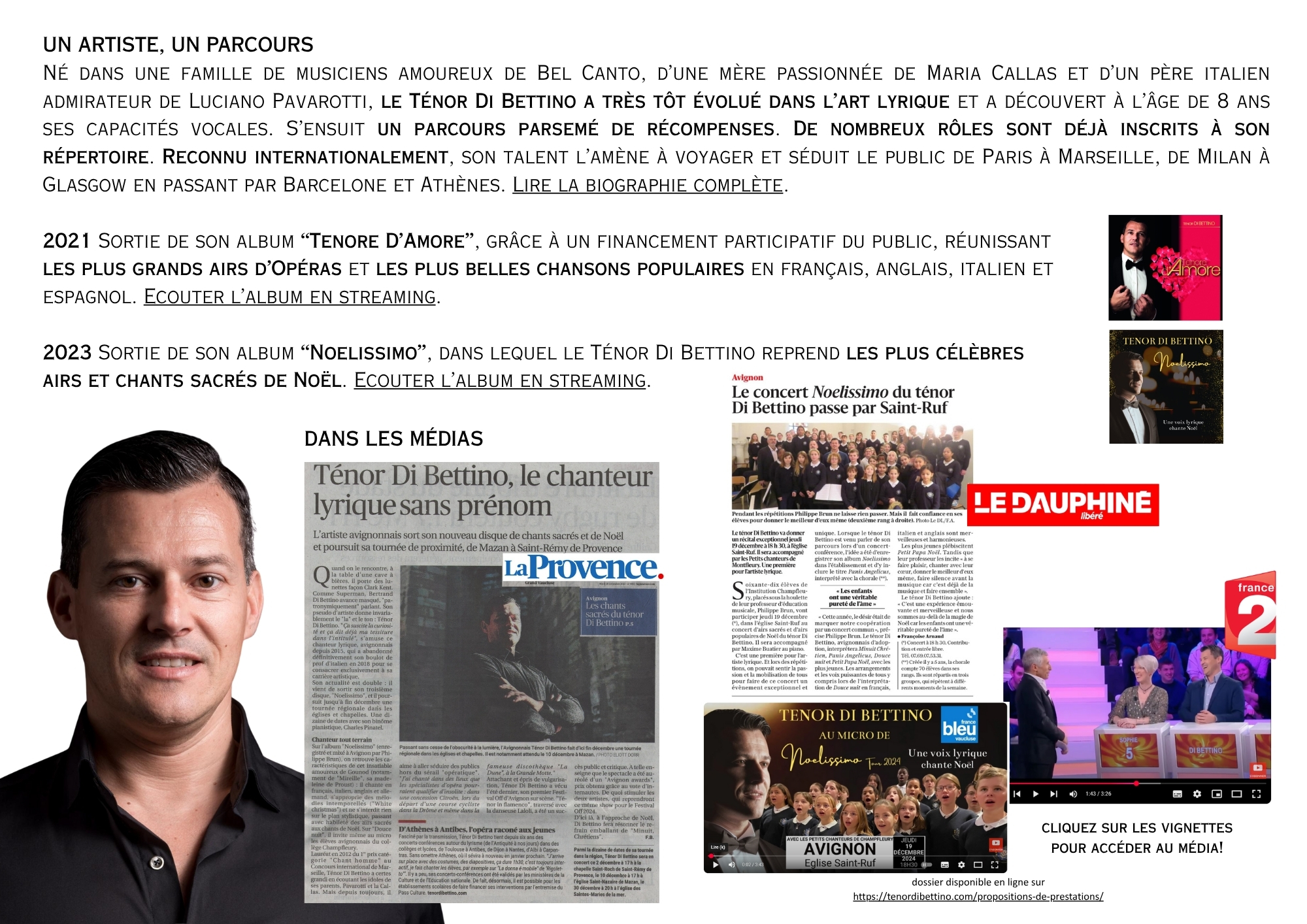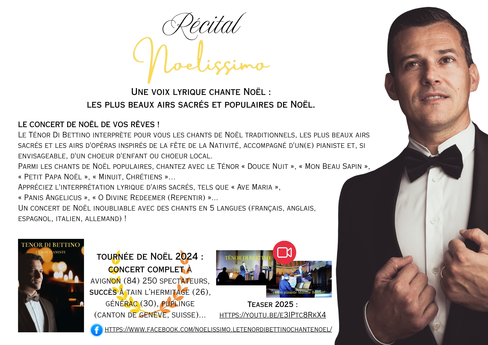 Le Ténor Di Bettino interprète pour vous les chants de Noël traditionnels, les plus beaux airs sacrés et les airs d’opéras inspirés de la fête de la Nativité, accompagné d’un(e) pianiste et, si envisageable, d’un choeur d’enfant ou choeur local.