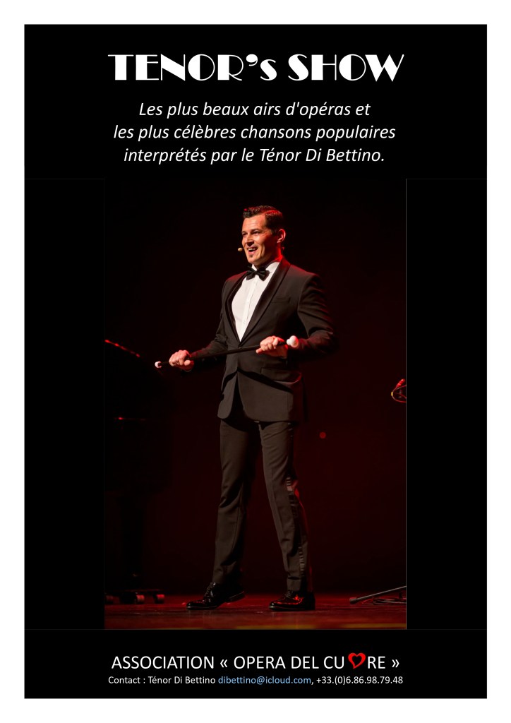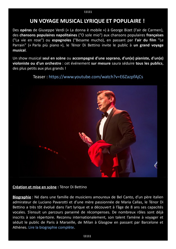 Des opéras de Giuseppe Verdi (« La donna è mobile ») à George Bizet (l’air de Carmen), des chansons populaires napolitaines (« O sole mio ») aux chansons populaires françaises (« La vie en rose ») ou espagnoles (« Besame mucho), en passant par l’air du film « Le Parrain » (« Parla più piano »), le Ténor Di Bettino invite le public à un grand voyage musical.