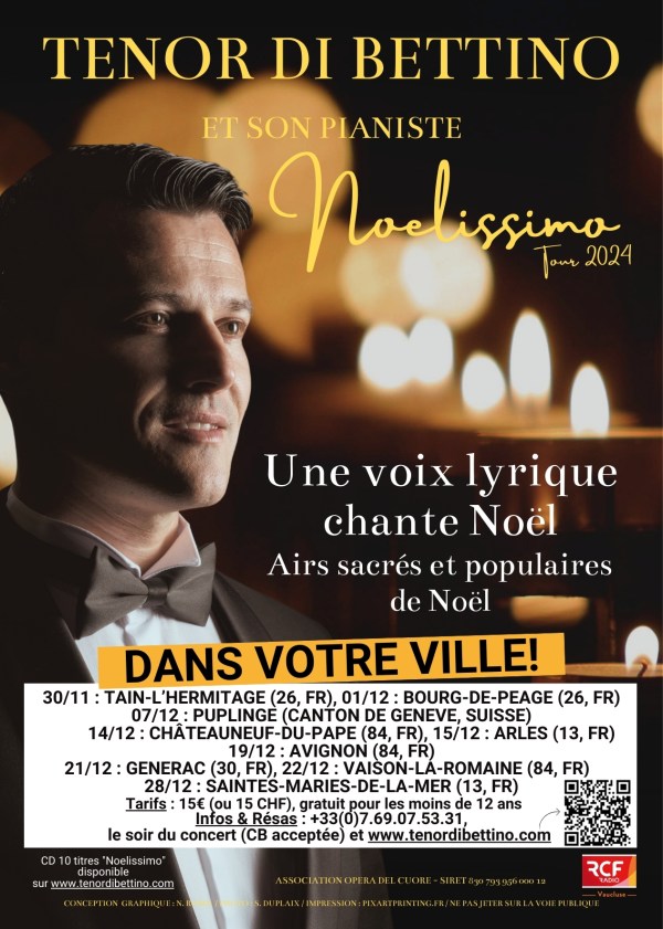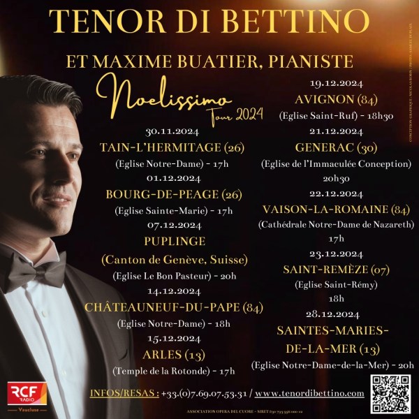 Le Ténor Di Bettino débutera le « Noelissimo » Tour 2024 le 30 novembre : la tournée passera dans la Drôme, le Vaucluse, l'Ardèche, le Gard, les Bouches-du-Rhône et en Suisse. Accompagné de Maxime Buatier au piano, le Ténor Di Bettino interprétera les plus beaux airs de Noël et airs sacrés dans les lieux les... Lire la Suite →