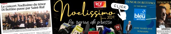 A la veille du dernier concert du "Noelissimo" Tour 2024 aux Saintes-Maries-de-la-Mer samedi 28 décembre à 20h en l'église Notre-Dame-de-la-Mer, le Ténor Di Bettino vous invite à découvrir dès maintenant la revue de presse de la tournée. Pour cette deuxième édition de "Noelissimo", davantage de médias se sont intéressés à la tournée, de nombreux articles... Lire la Suite →
